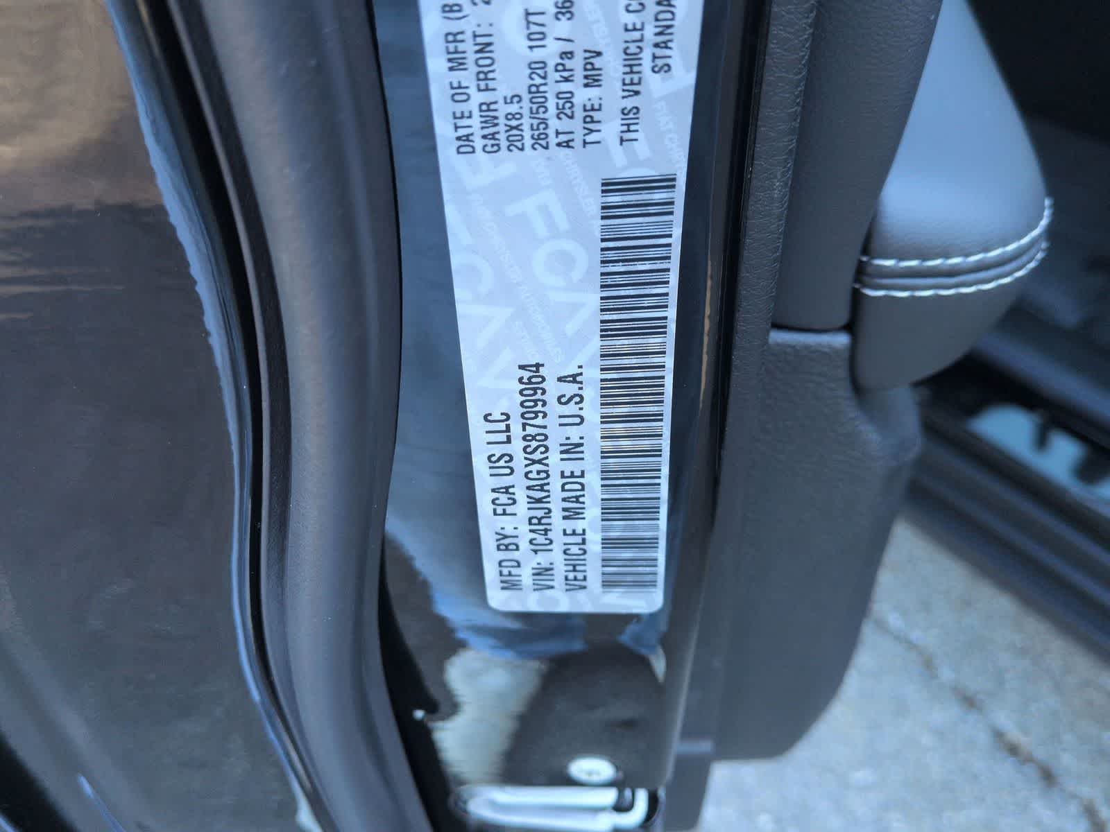 Grand Cherokee L Altitude X is nicely equipped with Quick Order Package 23M Altitude X (115V Auxiliary Power Outlet, 3rd Row Charge-Only USB Ports, Altitude X, Black Headliner, Capri Leatherette/Suede Seats, Delete Laredo Badge, Gloss Black Exterior Accents, Heated Front Seats, Heated Steering Wheel, Power Liftgate, Power Sunroof, Rain Sensitive Windshield Wipers, Remote Start System, Selectable Tire Fill Alert, Wheels: 18 x 8.0 Fully Painted Aluminum 1, and Wireless Charging Pad), Trailer Tow Package (180 Amp Alternator, 7 and 4 Pin Wiring Harness, Automatic Headlamp Leveling System, Class IV Receiver Hitch, Dual Exhaust Tips, Heavy-Duty Engine Cooling, Rear Load Leveling Suspension, and Trailer Hitch Zoom), 3.45 Rear Axle Ratio, 3rd row seats: split-bench, 4-Wheel Disc Brakes, 6 Speakers, ABS brakes, Air Conditioning, Alloy wheels, AM/FM radio: SiriusXM, Anti-whiplash front head restraints, Automatic temperature control, Brake assist, Bumpers: body-color, Cloth Seats, Compass, Delay-off headlights, Driver door bin, Driver vanity mirror, Dual front impact airbags, Dual front side impact airbags, Electronic Stability Control, Emergency communication system, Four wheel independent suspension, Front anti-roll bar, Front Bucket Seats, Front Center Armrest w/Storage, Front dual zone A/C, Front reading lights, Fully automatic headlights, Heated door mirrors, Illuminated entry, Knee airbag, Low tire pressure warning, Manual Fold Seatbacks, Model Year Tracking, Normal Duty Suspension, Occupant sensing airbag, Outside temperature display, Overhead airbag, Overhead console, Panic alarm, ParkView Rear Back-Up Camera, Passenger door bin, Passenger vanity mirror, Power door mirrors, Power driver seat, Power steering, Power windows, Radio data system, Radio: Uconnect 5 with 8.4 Display, Rear air conditioning, Rear anti-roll bar, Rear reading lights, Rear window defroster, Rear window wiper, Reclining 3rd row seat, Remote keyless entry, Security system, Speed control, Speed-Sensitive Wipers, Split folding rear seat, Spoiler, Steering wheel mounted audio controls, Tachometer, Telescoping steering wheel, Tilt steering wheel, Traction control, Trip computer, Variably intermittent wipers, Voltmeter, Wheels: 18 x 8.0 Fully Painted Aluminum, and Wheels: 20 x 8.5 Gloss Black Painted Aluminum.