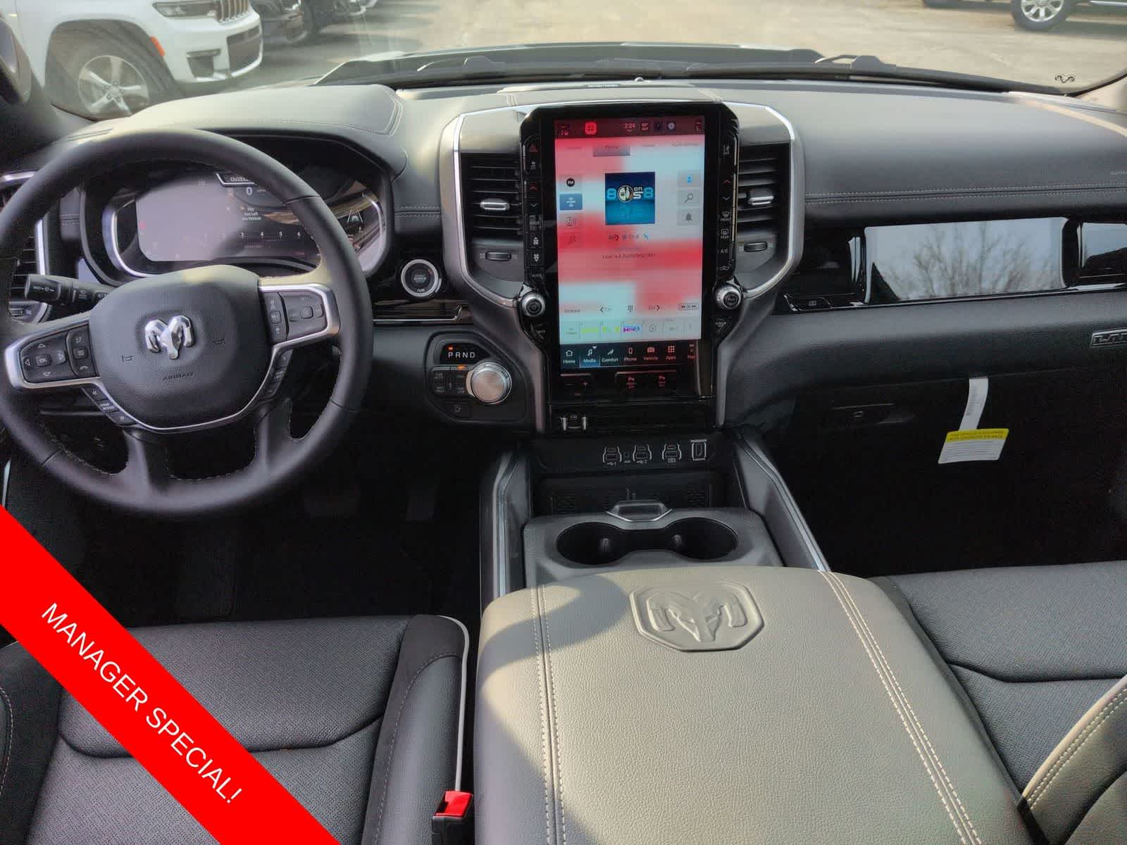 1500 Laramie is nicely equipped with Advanced Safety Group II (12-Way/1-Way Trailer Connector, Active Driving Assist System, Drowsy Driver Detection, Evasive Steer Assist, Exterior Mirrors Approach Lamps, Intersection Collision Assist System, Surround View Camera System, and Traffic Sign Recognition), Laramie Level 2 Equipment Group (14.4 Touchscreen Display, 4G LTE Wi-Fi Hot Spot, Cluster 12 TFT Color Display, Connected Travel and Traffic Services, Connectivity - US/Canada, Front Passenger Interactive Display, GPS Navigation, Harman/Kardon 19 Speaker Premium Sound, Integrated Center Stack Radio, Integrated Voice Command with Bluetooth®, Power Tailgate, Radio: Uconnect 5 Nav with 14.4 Display, Rain Sensitive Windshield Wipers, SiriusXM Radio Service, SiriusXM with 360L, and USB Host Flip), Night Edition (Accent Color Door Handles, Accent Color Premium Power Mirrors, Accent Color Tailgate Handle, Anti-Spin Differential Rear Axle, Auto Power-Folding Mirrors, Auto-Dimming Exterior Driver Mirror, Black Exterior Truck Badging, Black Headlamp Bezels, Black Interior Accents, Black Painted Exterior Mirrors Caps, Black Tail Lamp Bezels, Body Color Front Bumper, Body Color Rear Bumper with Step Pads, Convex Wide-Angle Exterior Mirror Insert, Dual Exhaust with Black Tips, Exterior Mirrors Courtesy Lamps, Exterior Mirrors with Heating Element, Exterior Mirrors with Memory, Exterior Mirrors with Supplemental Signals, Grille Surround 3 Black Texture 2 Black, Pirelli Brand Tires, Proximity Approach/Departure Lamps, RAM Grille Badge - Black, Sport Performance Hood, and Wheels: 22 x 9 Forged Aluminum), Quick Order Package 21H Laramie, Technology Group (Heads-Up Display and LED CHMSL Lamp), 10 Speakers, 3.55 Rear Axle Ratio, 4-Wheel Disc Brakes, ABS brakes, Active Noise Control System, Adjustable pedals, Air Conditioning, Alloy wheels, AM/FM radio: SiriusXM with 360L, Apple CarPlay/Android Auto, Audio memory, Auto High-beam Headlights, Auto-dimming door mirrors, Auto-dimming Rear-View mirror, Automatic temperature control, Brake assist, Bumpers: chrome, Chrome Exterior Mirrors, Compass, Delay-off headlights, Dome Dual LED Reading Lamp, Driver door bin, Driver vanity mirror, Dual front impact airbags, Dual front side impact airbags, Dual-Pane Panoramic Sunroof, Electronic Stability Control, Front anti-roll bar, Front Bucket Seats, Front Center Armrest w/Storage, Front dual zone A/C, Front fog lights, Front reading lights, Front wheel independent suspension, Fully automatic headlights, Garage door transmitter, Heated door mirrors, Heated front seats, Heated rear seats, Heated steering wheel, Illuminated entry, Leather steering wheel, Leather Trimmed Bucket Seats, LED Dome/Reading Lamp, Low tire pressure warning, Memory seat, Navigation System, Occupant sensing airbag, Off-Road Information Pages, Outside temperature display, Overhead airbag, Overhead console, Panic alarm, ParkView Rear Back-Up Camera, Passenger door bin, Passenger vanity mirror, Pedal memory, Power Deployable Running Boards, Power door mirrors, Power driver seat, Power passenger seat, Power steering, Power windows, Radio data system, Radio: Uconnect 5 Navigation with 12.0 Display, RAM Grille Badge - Chrome, Rear anti-roll bar, Rear reading lights, Rear seat center armrest, Rear step bumper, Re