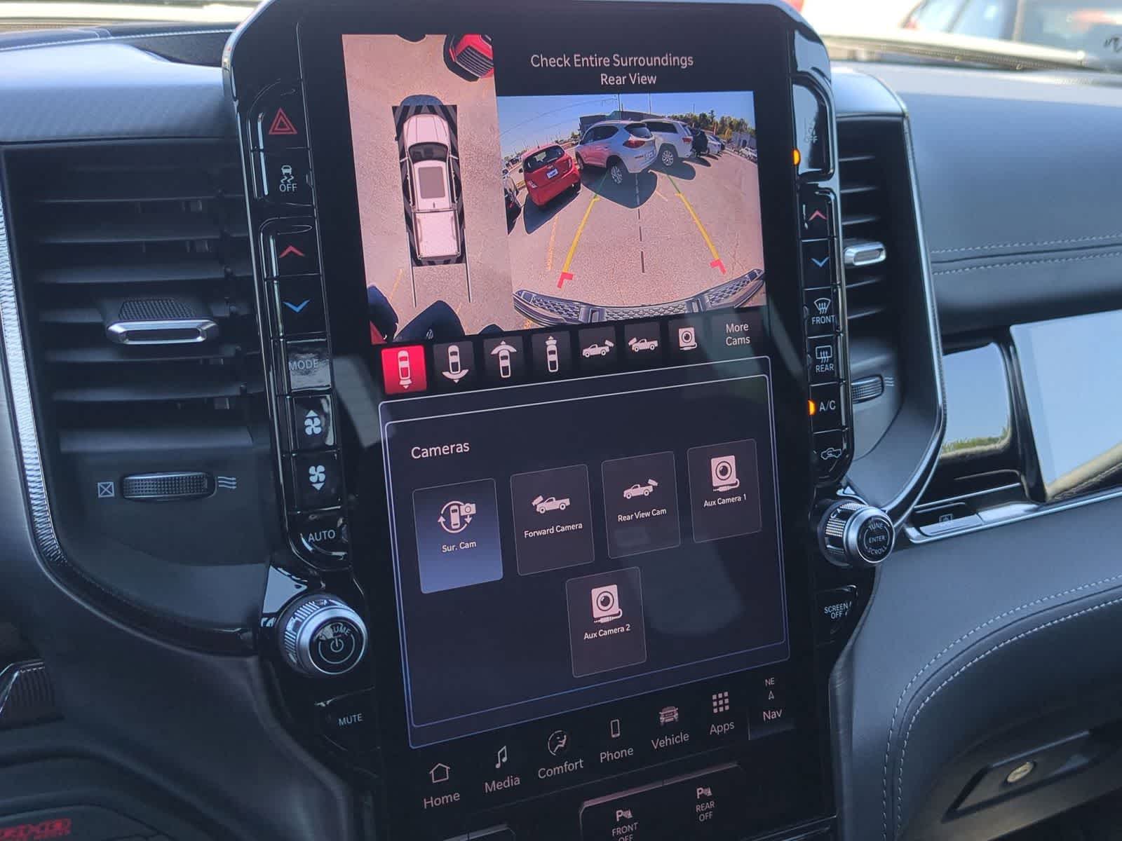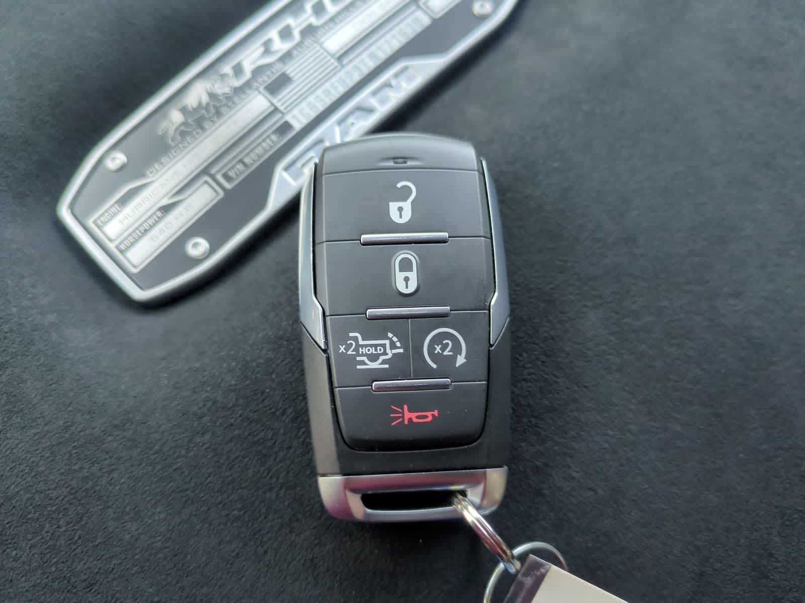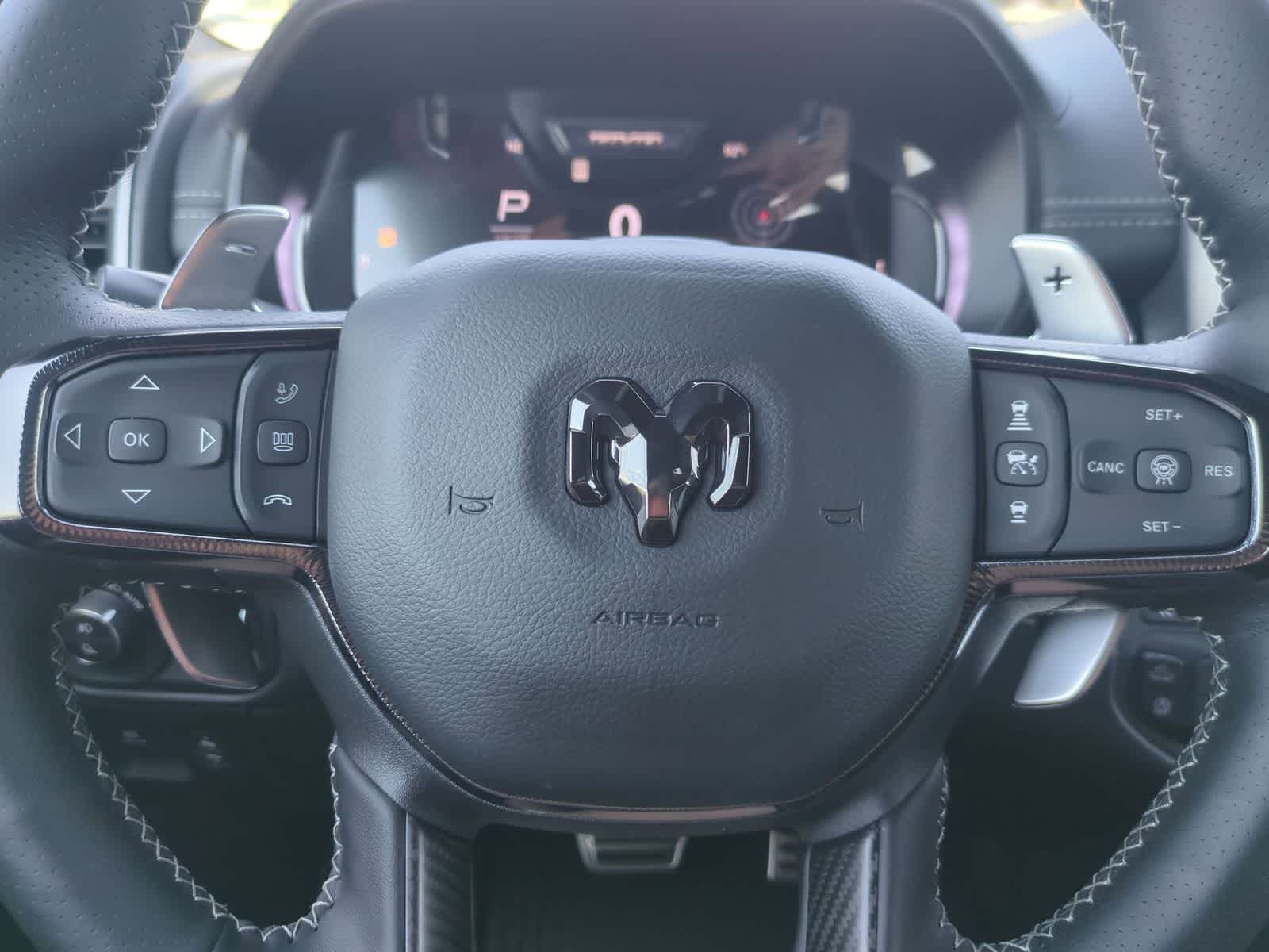 1500 RHO is nicely equipped with Quick Order Package 22Y RHO, RHO Level 1 Equipment Group (12-Way/1-Way Trailer Connector, 14.4 Touchscreen Display, 240 Amp Alternator, 4G LTE Wi-Fi Hot Spot, Connected Travel and Traffic Services, Connectivity - US/Canada, Disassociated Touchscreen Display, Driver Power Seat Back Massage, Driver Seat Memory, Driver/Passenger Wrapped Assist Handles, Drowsy Driver Detection, Dual Wireless Charging Pad, Evasive Steer Assist, Exterior Mirrors with Memory, Front Passenger Interactive Display, Front Passenger Power Seat Back Massage, Full Length Premium Upgraded Floor Console, GPS Navigation, Hands-Free Active Driving Assist System, Harman/Kardon 19 Speaker Premium Sound, HD Radio, Heads-Up Display, Heated Second Row Seats, Integrated Center Stack Radio, Integrated Voice Command with Bluetooth®, Intersection Collision Assist System, Leather/Carbon Flat-Bottom Steering Wheel, LED CHMSL Lamp, Luxury Front Door Trim Panel, Power Adjustable Pedals with Memory, Power Tailgate, Premium Wrapped Instrument Panel Bezel, Radio: Uconnect 5 Nav with 14.4 Display, Radio/Driver Seat/Mirrors/Pedals Memory, Rain Sensitive Windshield Wipers, Real Carbon Fiber Interior Accents, Rear 60/40 Folding Split Recline Seat, SiriusXM Radio Service, Smartphone as a Key Capable, Surround View Camera System, Traffic Sign Recognition, USB Host Flip, Ventilated Front Seats, and Ventilated Rear Seats), 10 Speakers, 3.92 Rear Axle Ratio, 4-Wheel Disc Brakes, ABS brakes, Adaptive suspension, Adjustable pedals, Air Conditioning, Alloy wheels, AM/FM radio, Apple CarPlay/Android Auto, Auto High-beam Headlights, Auto Power-Folding Mirrors, Auto-dimming door mirrors, Auto-Dimming Exterior Driver Mirror, Auto-dimming Rear-View mirror, Automatic temperature control, Brake assist, Compass, Delay-off headlights, Dome Dual LED Reading Lamp, Driver door bin, Driver vanity mirror, Dual front impact airbags, Dual front side impact airbags, Dual-Pane Panoramic Sunroof, Electronic Stability Control, Exterior Mirrors Courtesy Lamps, Exterior Mirrors with Heating Element, Exterior Mirrors with Supplemental Signals, Exterior Parking Camera Rear, Flareside Box, Front anti-roll bar, Front Bucket Seats, Front Center Armrest w/Storage, Front dual zone A/C, Front fog lights, Front License Plate Bracket, Front reading lights, Front wheel independent suspension, Fully automatic headlights, Garage door transmitter, Heated door mirrors, Heated front seats, Heated steering wheel, Illuminated entry, Leather Shift Knob, Leather steering wheel, Leather Trimmed Bucket Seats, Low tire pressure warning, Navigation System, Occupant sensing airbag, Outside temperature display, Overhead airbag, Overhead console, Panic alarm, Passenger door bin, Passenger vanity mirror, Power door mirrors, Power driver seat, Power passenger seat, Power steering, Power windows, Radio data system, Radio: Uconnect 5 Navigation with 12.0 Display, Rear reading lights, Rear seat center armrest, Rear step bumper, Rear window defroster, Remote keyless entry, Security system, Speed control, Split folding rear seat, Sport steering wheel, Steering wheel mounted audio controls, Tachometer, Telescoping steering wheel, Tilt steering wheel, Traction control, Trip computer, Turn signal indicator mirrors, Variably intermittent wipers, Voltmeter, Wheels: 18 x 9 Bead-Lock Aluminum, and Wheels: 18 x 9 Black Paint/Polish Aluminum.