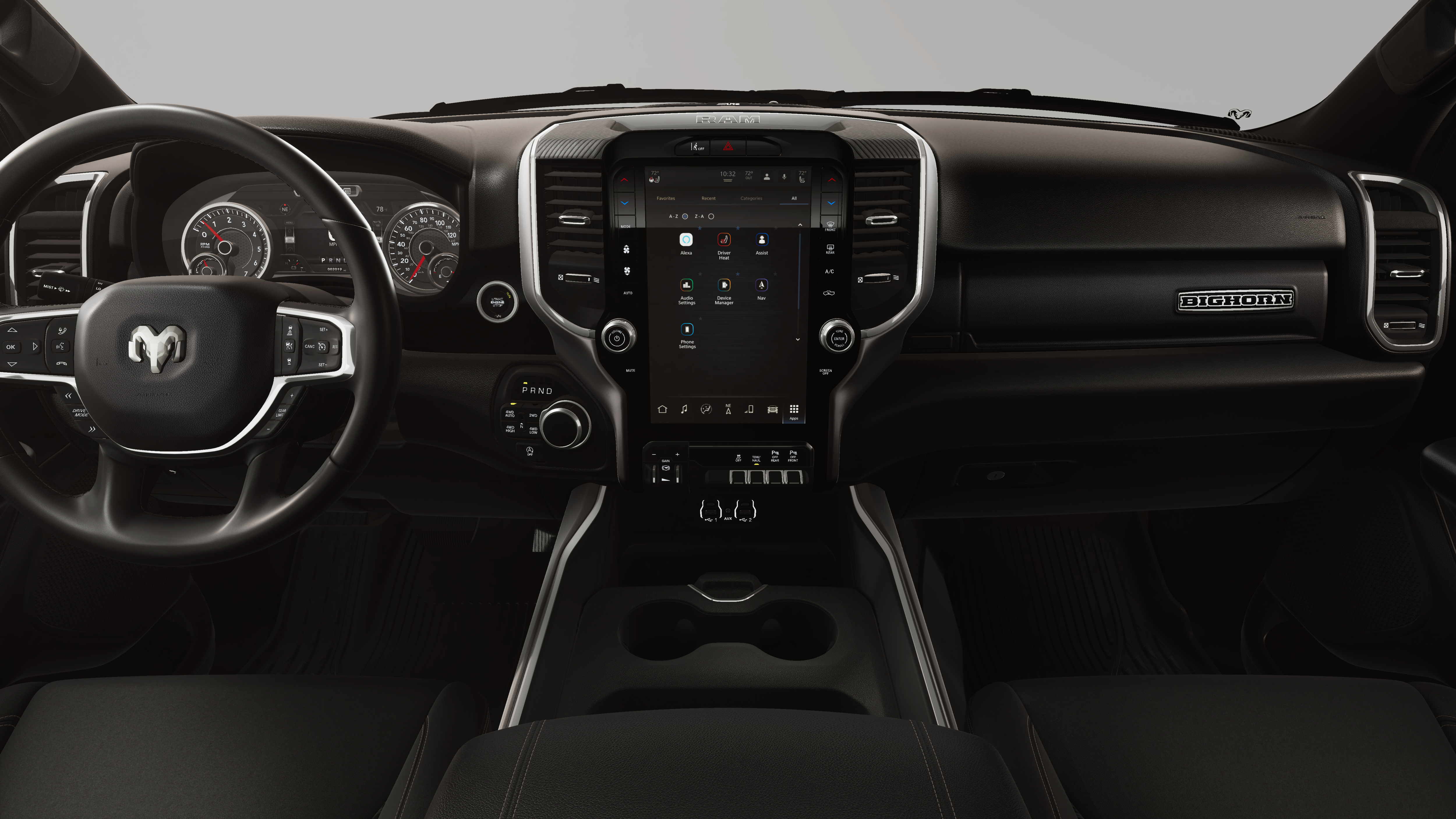 1500 Big Horn/Lone Star is nicely equipped with Bed Utility Group (Exterior 115V AC Outlet, MOPAR 4 Adjustable Cargo Tie-Down Hooks, MOPAR Spray in Bedliner, and Pick-Up Box Lighting), Big Horn Level 2 Equipment Group (115V Auxiliary Power Outlet, 115V Auxiliary Rear Power Outlet, 12 Touchscreen Display, 2nd Row in Floor Storage Bins, 3 Rear Seat Head Restraints, 4 Way Front Headrests, 400W Inverter, 4G LTE Wi-Fi Hot Spot, 9 Amplified Speakers with Subwoofer, Air Conditioning ATC with Dual Zone Control, Apple CarPlay, Auto Power-Folding Mirrors, Auto-Dimming Exterior Driver Mirror, Auto-Dimming Rear-View Mirror, Black Exterior Mirrors, Black Premium Power Mirrors, Body Color Fender Flares, Bucket Seats, Center Console Parts Module, Cluster 7.0 TFT Color Display, Configurable Drive Mode, Connected Travel and Traffic Services, Connectivity - US/Canada, Convex Wide-Angle Exterior Mirror Insert, Deluxe Cloth Bucket Seats, Disassociated Touchscreen Display, Exterior Mirrors Courtesy Lamps, Exterior Mirrors with Heating Element, Exterior Mirrors with Supplemental Signals, Front Seat Back Map Pockets, Full Length Floor Console, Global Telematics Box Module, Glove Box Lamp, Google Android Auto, GPS Antenna Input, GPS Navigation, HD Radio, Heated Front Seats, Heated Steering Wheel, Integrated Center Stack Radio, Integrated Voice Command with Bluetooth®, Leather Wrapped Steering Wheel, LED Dome Lamp with on/Off Switch, LED Footwell Lighting, Manual Adjust 4-Way Front Passenger Seat, Media Hub with 2 Charge Only USBs, Overhead LED Lamps, Power 2-Way Driver Lumbar Adjust, Power Adjust 8-Way Driver Seat, Power Adjustable Pedals, Premium Overhead Console, Radio: Uconnect 5 Navigation with 12.0 Display, Rear 60/40 Folding Seat, Rear Center Armrest, Rear Power Sliding Window, Rear Window Defroster, Remote Tailgate Release, Security Alarm, SiriusXM Radio Service, SiriusXM with 360L, Steering Wheel Mounted Audio Controls, Sun Visors with Illuminated Vanity Mirrors, Universal Garage Door Opener, and USB Host Flip), Night Edition (Accent Color Door Handles, Accent Color Premium Power Mirrors, Accent Color Tailgate Handle, Anti-Spin Differential Rear Axle, Black Exterior Truck Badging, Black Headlamp Bezels, Black Interior Accents, Black Painted Exterior Mirrors Caps, Black Tail Lamp Bezels, Body Color Front Bumper, Body Color Rear Bumper with Step Pads, Dual Exhaust with Black Tips, Grille Black Surround Black Mesh, RAM Grille Badge - Black, and Wheels: 20 x 9.0 Aluminum Painted Clad), Quick Order Package 27Z Big Horn, 4-Wheel Disc Brakes, 48V Belt Starter Generator, 6 Speakers, ABS brakes, Air Conditioning, Alloy wheels, AM/FM radio, Apple CarPlay/Android Auto, Auto High-beam Headlights, Brake assist, Bumpers: chrome, Cloth Bucket Seats, Compass, Delay-off headlights, Driver door bin, Dual front impact airbags, Dual front side impact airbags, Electronic Stability Control, Front anti-roll bar, Front Bucket Seats, Front Center Armrest w/Storage, Front fog lights, Front reading lights, Front wheel independent suspension, Fully automatic headlights, Heated door mirrors, Illuminated entry, Low tire pressure warning, Manual Adjust 4-Way Driver Seat, Manual Folding Exterior Mirrors, Mopar Black Tubular Side Steps, MOPAR Front and Rear Rubber Floor Mats, Occupant sensing airbag, Outside temperature display, Overhead airbag, Overhead console, Panic