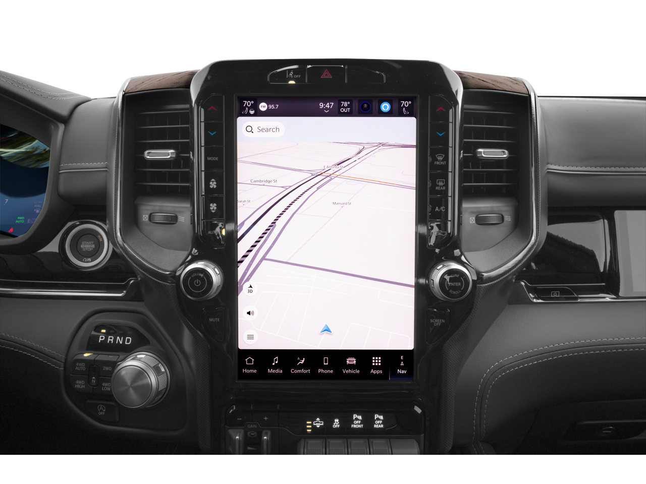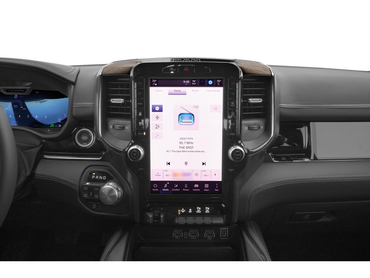 1500 Limited is nicely equipped with Bed Utility Group (Exterior 115V AC Outlet and MOPAR 4 Adjustable Cargo Tie-Down Hooks), Limited Level An Equipment Group (12-Way/1-Way Trailer Connector, 14.4 Touchscreen Display, 240 Amp Alternator, 4G LTE Wi-Fi Hot Spot, Apple CarPlay, Connected Travel and Traffic Services, Connectivity - US/Canada, Disassociated Touchscreen Display, Drowsy Driver Detection, Evasive Steer Assist, Global Telematics Box Module, Google Android Auto, GPS Antenna Input, GPS Navigation, Hands-Free Active Driving Assist System, HD Radio, Heads-Up Display, Integrated Center Stack Radio, Integrated Voice Command with Bluetooth®, Intersection Collision Assist System, LED CHMSL Lamp, Radio: Uconnect 5 Nav with 14.4 Display, RamBox Cargo Management System, SiriusXM Radio Service, SiriusXM with 360L, Smartphone as a Key Capable, Surround View Camera System, Traffic Sign Recognition, Tri-Fold Tonneau Cover, and USB Host Flip), Night Edition (Accent Color Door Handles, Accent Color Premium Power Mirrors, Accent Color Tailgate Handle, Auto Power-Folding Mirrors, Auto-Dimming Exterior Driver Mirror, Black Day Light Opening Moldings, Black Exterior Truck Badging, Black Grille Surround Texture 7 Black, Black Headlamp Bezels, Black Painted Exterior Mirrors Caps, Black Tail Lamp Bezels, Body Color Front Bumper, Body Color Rear Bumper with Step Pads, Convex Wide-Angle Exterior Mirror Insert, Dual Exhaust with Black Tips, Exterior Mirrors Courtesy Lamps, Exterior Mirrors with Heating Element, Exterior Mirrors with Memory, Exterior Mirrors with Supplemental Signals, Pirelli Brand Tires, RAM Grille Badge - Black, Sport Performance Hood, and Wheels: 22 x 9 Premium Black Aluminum), Quick Order Package 27M Limited, 19 Speakers, 3.92 Rear Axle Ratio, 4-Wheel Disc Brakes, ABS brakes, Active Noise Control System, Adjustable pedals, Air Conditioning, Alloy wheels, AM/FM radio, Apple CarPlay/Android Auto, Audio memory, Auto High-beam Headlights, Auto-dimming door mirrors, Auto-dimming Rear-View mirror, Auto-leveling suspension, Automatic temperature control, Bodyside moldings, Brake assist, Bumpers: chrome, Chrome Exterior Mirrors, Compass, Delay-off headlights, Dome Dual LED Reading Lamp, Driver door bin, Driver vanity mirror, Dual front impact airbags, Dual front side impact airbags, Dual-Pane Panoramic Sunroof, Electronic Stability Control, Exterior Parking Camera Rear, Front anti-roll bar, Front Bucket Seats, Front Center Armrest w/Storage, Front dual zone A/C, Front fog lights, Front reading lights, Front wheel independent suspension, Fully automatic headlights, Garage door transmitter, Genuine wood console insert, Genuine wood dashboard insert, Genuine wood door panel insert, harman/kardon® Speakers, Heated door mirrors, Heated front seats, Heated rear seats, Heated steering wheel, Illuminated entry, Leather steering wheel, LED Dome/Reading Lamp, Low tire pressure warning, Memory seat, Navigation System, Occupant sensing airbag, Outside temperature display, Overhead airbag, Overhead console, Panic alarm, Passenger door bin, Passenger vanity mirror, Pedal memory, Power door mirrors, Power driver seat, Power passenger seat, Power steering, Power windows, Premium Quilted Leather Bucket Seats, Radio data system, Radio: Uconnect 5 Navigation with 12.0 Display, Rain sensing wipers, Rear anti-roll bar, Rear reading lights, Rear seat center armrest, R