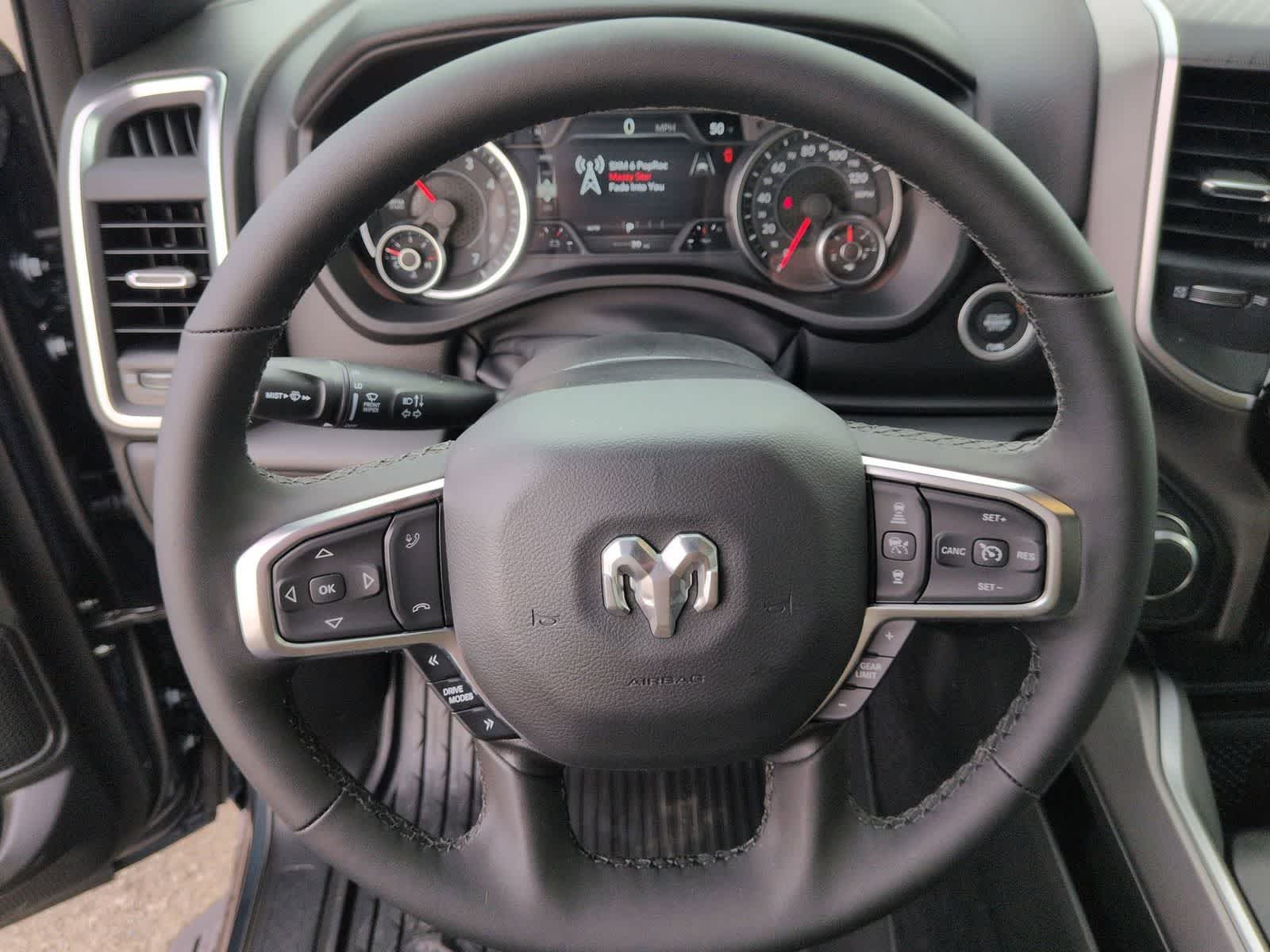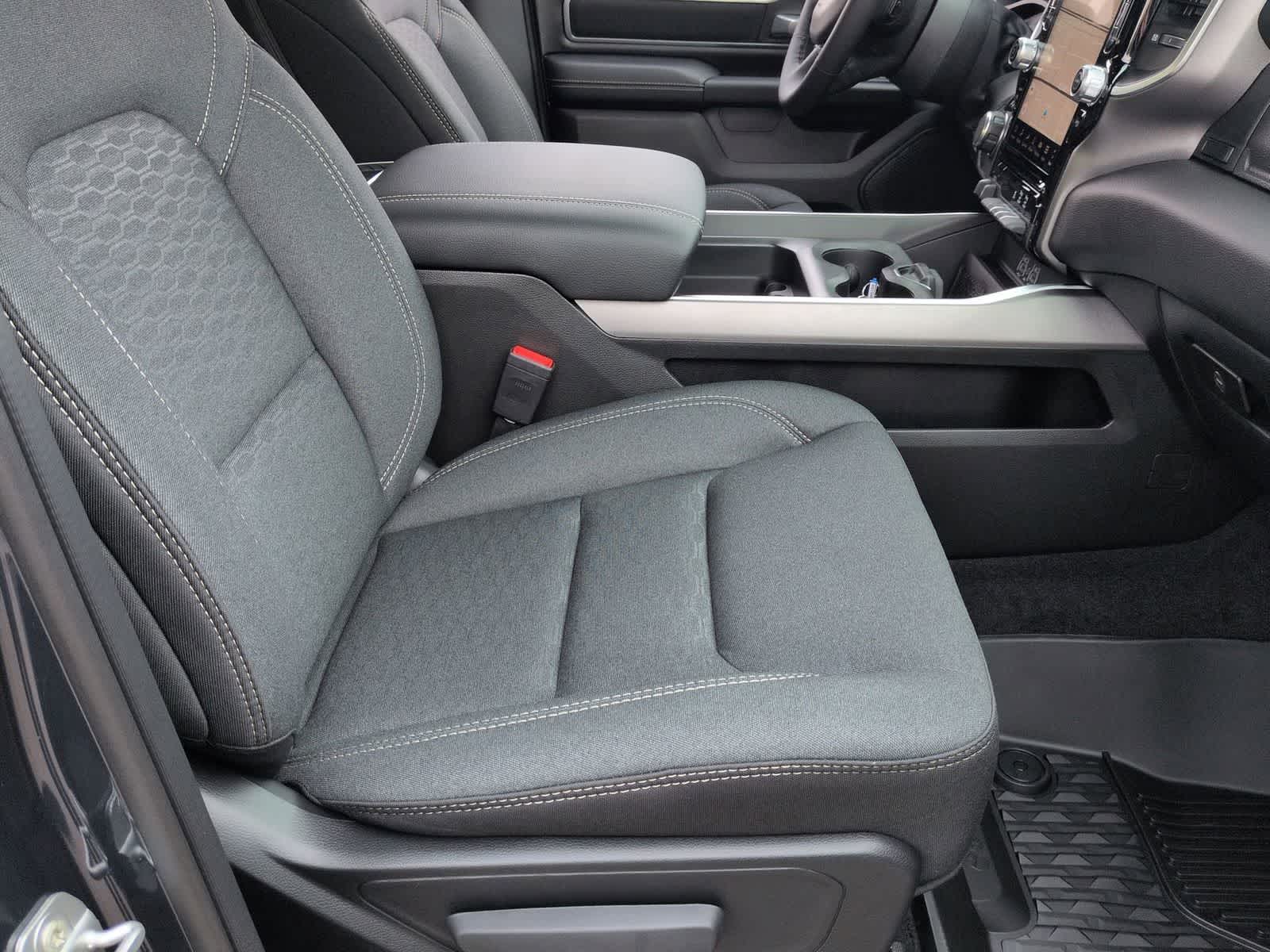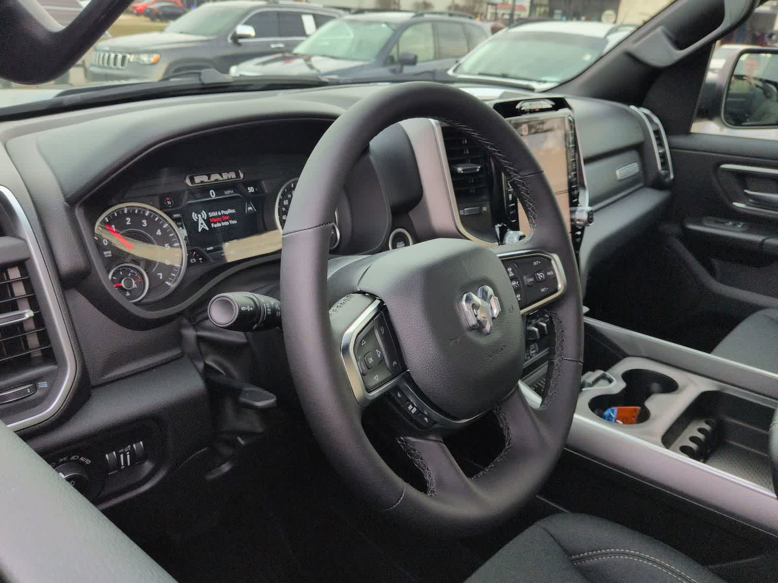 1500 Big Horn/Lone Star is nicely equipped with Bed Utility Group (Exterior 115V AC Outlet, MOPAR 4 Adjustable Cargo Tie-Down Hooks, MOPAR Spray in Bedliner, and Pick-Up Box Lighting), Big Horn Level 2 Equipment Group (115V Auxiliary Power Outlet, 115V Auxiliary Rear Power Outlet, 12 Touchscreen Display, 2nd Row in Floor Storage Bins, 3 Rear Seat Head Restraints, 4 Way Front Headrests, 400W Inverter, 4G LTE Wi-Fi Hot Spot, 9 Amplified Speakers with Subwoofer, Air Conditioning ATC with Dual Zone Control, Apple CarPlay, Auto Power-Folding Mirrors, Auto-Dimming Exterior Driver Mirror, Auto-Dimming Rear-View Mirror, Black Exterior Mirrors, Black Premium Power Mirrors, Body Color Fender Flares, Bucket Seats, Center Console Parts Module, Cluster 7.0 TFT Color Display, Configurable Drive Mode, Connected Travel and Traffic Services, Connectivity - US/Canada, Convex Wide-Angle Exterior Mirror Insert, Deluxe Cloth Bucket Seats, Disassociated Touchscreen Display, Exterior Mirrors Courtesy Lamps, Exterior Mirrors with Heating Element, Exterior Mirrors with Supplemental Signals, Front Seat Back Map Pockets, Full Length Floor Console, Global Telematics Box Module, Glove Box Lamp, Google Android Auto, GPS Antenna Input, GPS Navigation, HD Radio, Heated Front Seats, Heated Steering Wheel, Integrated Center Stack Radio, Integrated Voice Command with Bluetooth®, Leather Wrapped Steering Wheel, LED Dome Lamp with on/Off Switch, LED Footwell Lighting, Manual Adjust 4-Way Front Passenger Seat, Media Hub with 2 Charge Only USBs, Overhead LED Lamps, Power 2-Way Driver Lumbar Adjust, Power Adjust 8-Way Driver Seat, Power Adjustable Pedals, Premium Overhead Console, Radio: Uconnect 5 Navigation with 12.0 Display, Rear 60/40 Folding Seat, Rear Center Armrest, Rear Power Sliding Window, Rear Window Defroster, Remote Tailgate Release, Security Alarm, SiriusXM Radio Service, SiriusXM with 360L, Steering Wheel Mounted Audio Controls, Sun Visors with Illuminated Vanity Mirrors, Universal Garage Door Opener, and USB Host Flip), Night Edition (Accent Color Door Handles, Accent Color Premium Power Mirrors, Accent Color Tailgate Handle, Anti-Spin Differential Rear Axle, Black Exterior Truck Badging, Black Headlamp Bezels, Black Interior Accents, Black Painted Exterior Mirrors Caps, Black Tail Lamp Bezels, Body Color Front Bumper, Body Color Rear Bumper with Step Pads, Dual Exhaust with Black Tips, Grille Black Surround Black Mesh, RAM Grille Badge - Black, and Wheels: 20 x 9.0 Aluminum Painted Clad), Quick Order Package 27Z Big Horn, 4-Wheel Disc Brakes, 48V Belt Starter Generator, 6 Speakers, ABS brakes, Air Conditioning, Alloy wheels, AM/FM radio, Apple CarPlay/Android Auto, Auto High-beam Headlights, Brake assist, Bumpers: chrome, Cloth Bucket Seats, Compass, Delay-off headlights, Driver door bin, Dual front impact airbags, Dual front side impact airbags, Electronic Stability Control, Front anti-roll bar, Front Bucket Seats, Front Center Armrest w/Storage, Front fog lights, Front reading lights, Front wheel independent suspension, Fully automatic headlights, Heated door mirrors, Illuminated entry, Low tire pressure warning, Manual Adjust 4-Way Driver Seat, Manual Folding Exterior Mirrors, Mopar Black Tubular Side Steps, MOPAR Front and Rear Rubber Floor Mats, Occupant sensing airbag, Outside temperature display, Overhead airbag, Overhead console, Panic alarm, ParkView Rear Back-Up Camera, Passenger door bin, Passenger
