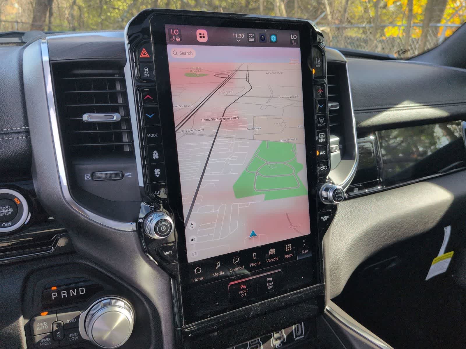 1500 Laramie is nicely equipped with Laramie Level 2 Equipment Group (14.4 Touchscreen Display, 4G LTE Wi-Fi Hot Spot, Cluster 12 TFT Color Display, Connected Travel and Traffic Services, Connectivity - US/Canada, Front Passenger Interactive Display, GPS Navigation, Harman/Kardon 19 Speaker Premium Sound, Integrated Center Stack Radio, Integrated Voice Command with Bluetooth®, Power Tailgate, Radio: Uconnect 5 Nav with 14.4 Display, Rain Sensitive Windshield Wipers, SiriusXM Radio Service, SiriusXM with 360L, and USB Host Flip), Night Edition (Accent Color Door Handles, Accent Color Premium Power Mirrors, Accent Color Tailgate Handle, Anti-Spin Differential Rear Axle, Auto Power-Folding Mirrors, Auto-Dimming Exterior Driver Mirror, Black Exterior Truck Badging, Black Headlamp Bezels, Black Interior Accents, Black Painted Exterior Mirrors Caps, Black Tail Lamp Bezels, Body Color Front Bumper, Body Color Rear Bumper with Step Pads, Convex Wide-Angle Exterior Mirror Insert, Dual Exhaust with Black Tips, Exterior Mirrors Approach Lamps, Exterior Mirrors Courtesy Lamps, Exterior Mirrors with Heating Element, Exterior Mirrors with Memory, Exterior Mirrors with Supplemental Signals, Grille Surround 3 Black Texture 2 Black, Pirelli Brand Tires, Proximity Approach/Departure Lamps, RAM Grille Badge - Black, Sport Performance Hood, and Wheels: 22 x 9 Forged Aluminum), Quick Order Package 21H Laramie, 10 Speakers, 3.55 Rear Axle Ratio, 4-Wheel Disc Brakes, ABS brakes, Active Noise Control System, Air Conditioning, Alloy wheels, AM/FM radio: SiriusXM with 360L, Apple CarPlay/Android Auto, Audio memory, Auto High-beam Headlights, Auto-dimming door mirrors, Auto-dimming Rear-View mirror, Automatic temperature control, Brake assist, Bumpers: chrome, Chrome Exterior Mirrors, Compass, Delay-off headlights, Dome Dual LED Reading Lamp, Driver door bin, Driver vanity mirror, Dual front impact airbags, Dual front side impact airbags, Dual-Pane Panoramic Sunroof, Electronic Stability Control, Front anti-roll bar, Front Bucket Seats, Front Center Armrest w/Storage, Front dual zone A/C, Front fog lights, Front reading lights, Front wheel independent suspension, Fully automatic headlights, Garage door transmitter, Heated door mirrors, Heated front seats, Heated rear seats, Heated steering wheel, Illuminated entry, Leather steering wheel, Leather Trimmed Bucket Seats, LED Dome/Reading Lamp, Low tire pressure warning, Memory seat, Navigation System, Occupant sensing airbag, Off-Road Information Pages, Outside temperature display, Overhead airbag, Overhead console, Panic alarm, ParkView Rear Back-Up Camera, Passenger door bin, Passenger vanity mirror, Power Deployable Running Boards, Power door mirrors, Power driver seat, Power passenger seat, Power steering, Power windows, Radio data system, Radio: Uconnect 5 Navigation with 12.0 Display, RAM Grille Badge - Chrome, Rear anti-roll bar, Rear reading lights, Rear seat center armrest, Rear step bumper, Remote keyless entry, Security system, Speed control, Split folding rear seat, Steering wheel mounted audio controls, Tachometer, Telescoping steering wheel, Tilt steering wheel, Traction control, Trip computer, Turn signal indicator mirrors, Variably intermittent wipers, Ventilated front seats, Voltmeter, and Wheels: 20 x 9 Premium Paint/Polish.