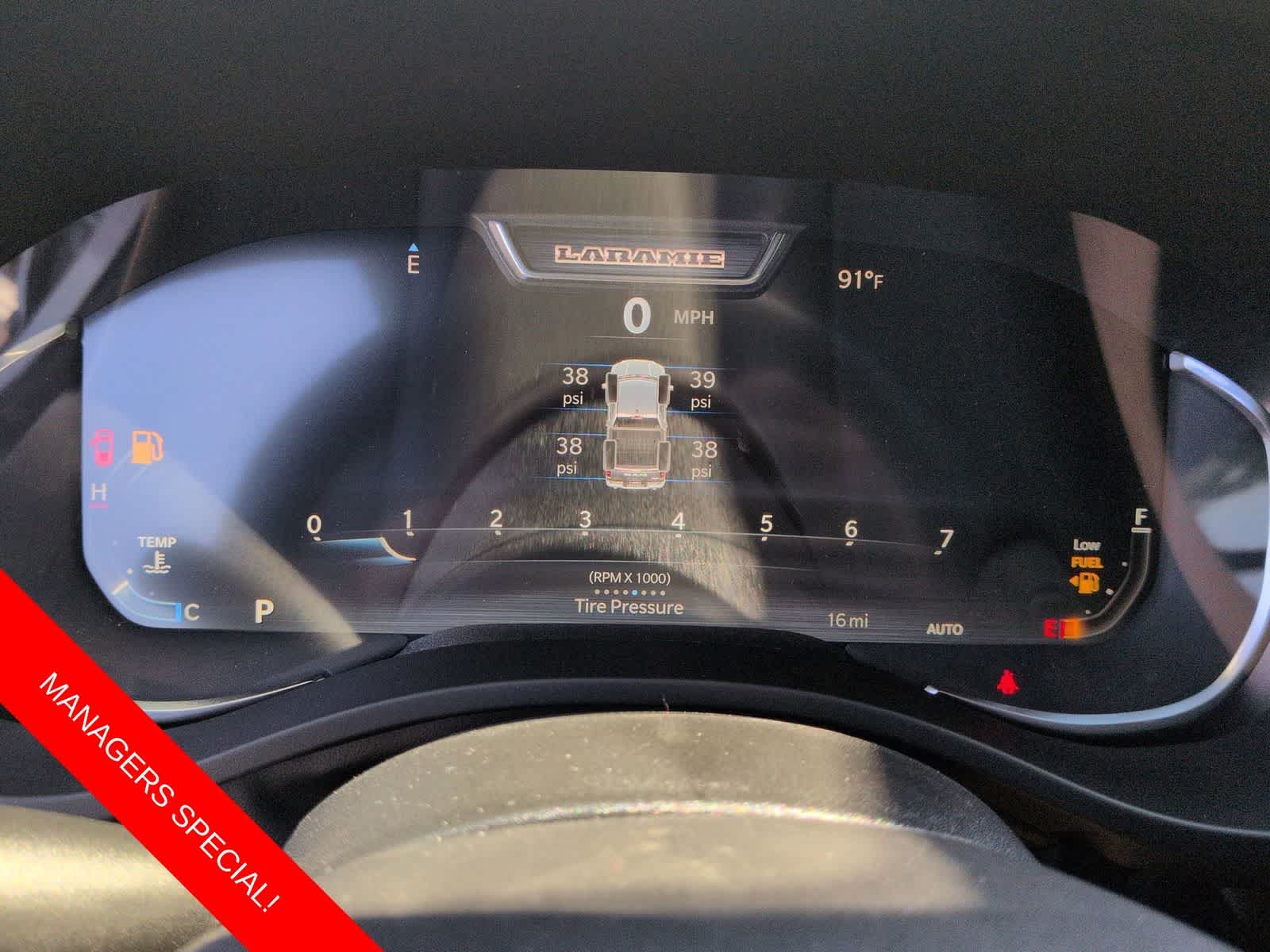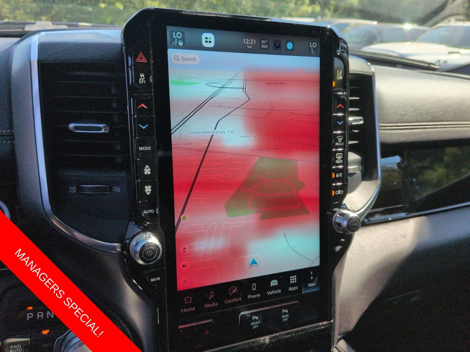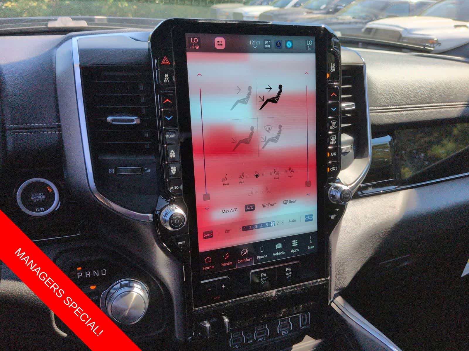 1500 Laramie is nicely equipped with Laramie Level 2 Equipment Group (14.4 Touchscreen Display, 4G LTE Wi-Fi Hot Spot, Cluster 12 TFT Color Display, Connected Travel and Traffic Services, Connectivity - US/Canada, Front Passenger Interactive Display, GPS Navigation, Harman/Kardon 19 Speaker Premium Sound, Integrated Center Stack Radio, Integrated Voice Command with Bluetooth®, Power Tailgate, Radio: Uconnect 5 Nav with 14.4 Display, Rain Sensitive Windshield Wipers, SiriusXM Radio Service, SiriusXM with 360L, and USB Host Flip), Night Edition (Accent Color Door Handles, Accent Color Premium Power Mirrors, Accent Color Tailgate Handle, Anti-Spin Differential Rear Axle, Auto Power-Folding Mirrors, Auto-Dimming Exterior Driver Mirror, Black Exterior Truck Badging, Black Headlamp Bezels, Black Interior Accents, Black Painted Exterior Mirrors Caps, Black Tail Lamp Bezels, Body Color Front Bumper, Body Color Rear Bumper with Step Pads, Convex Wide-Angle Exterior Mirror Insert, Dual Exhaust with Black Tips, Exterior Mirrors Approach Lamps, Exterior Mirrors Courtesy Lamps, Exterior Mirrors with Heating Element, Exterior Mirrors with Memory, Exterior Mirrors with Supplemental Signals, Grille Surround 3 Black Texture 2 Black, Pirelli Brand Tires, Proximity Approach/Departure Lamps, RAM Grille Badge - Black, Sport Performance Hood, and Wheels: 22 x 9 Forged Aluminum), Quick Order Package 21H Laramie, 10 Speakers, 3.55 Rear Axle Ratio, 4-Wheel Disc Brakes, ABS brakes, Active Noise Control System, Air Conditioning, Alloy wheels, AM/FM radio: SiriusXM with 360L, Apple CarPlay/Android Auto, Audio memory, Auto High-beam Headlights, Auto-dimming door mirrors, Auto-dimming Rear-View mirror, Automatic temperature control, Brake assist, Bumpers: chrome, Chrome Exterior Mirrors, Compass, Delay-off headlights, Dome Dual LED Reading Lamp, Driver door bin, Driver vanity mirror, Dual front impact airbags, Dual front side impact airbags, Dual-Pane Panoramic Sunroof, Electronic Stability Control, Front anti-roll bar, Front Bucket Seats, Front Center Armrest w/Storage, Front dual zone A/C, Front fog lights, Front reading lights, Front wheel independent suspension, Fully automatic headlights, Garage door transmitter, Heated door mirrors, Heated front seats, Heated rear seats, Heated steering wheel, Illuminated entry, Leather steering wheel, Leather Trimmed Bucket Seats, LED Dome/Reading Lamp, Low tire pressure warning, Memory seat, Navigation System, Occupant sensing airbag, Off-Road Information Pages, Outside temperature display, Overhead airbag, Overhead console, Panic alarm, ParkView Rear Back-Up Camera, Passenger door bin, Passenger vanity mirror, Power Deployable Running Boards, Power door mirrors, Power driver seat, Power passenger seat, Power steering, Power windows, Radio data system, Radio: Uconnect 5 Navigation with 12.0 Display, RAM Grille Badge - Chrome, Rear anti-roll bar, Rear reading lights, Rear seat center armrest, Rear step bumper, Remote keyless entry, Security system, Speed control, Split folding rear seat, Steering wheel mounted audio controls, Tachometer, Telescoping steering wheel, Tilt steering wheel, Traction control, Trailer Brake Control, Trip computer, Turn signal indicator mirrors, Variably intermittent wipers, Ventilated front seats, Voltmeter, and Wheels: 20 x 9 Premium Paint/Polish.
