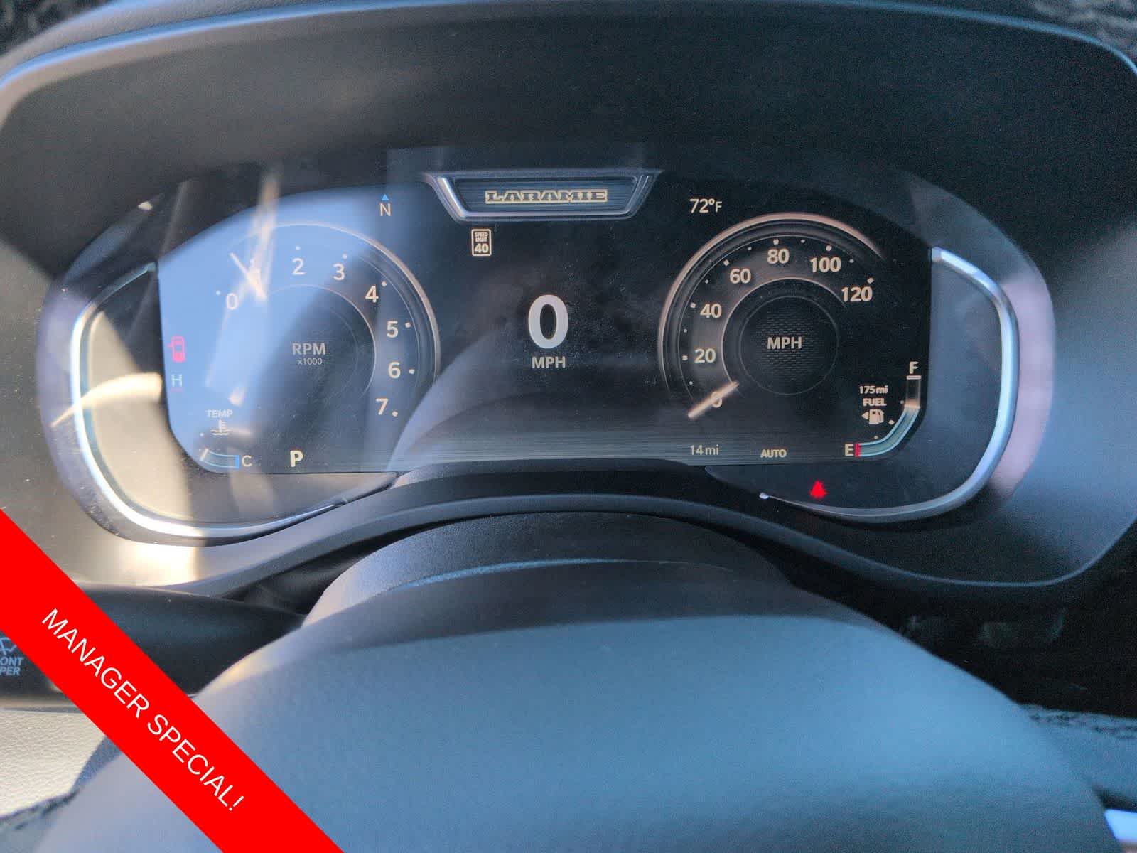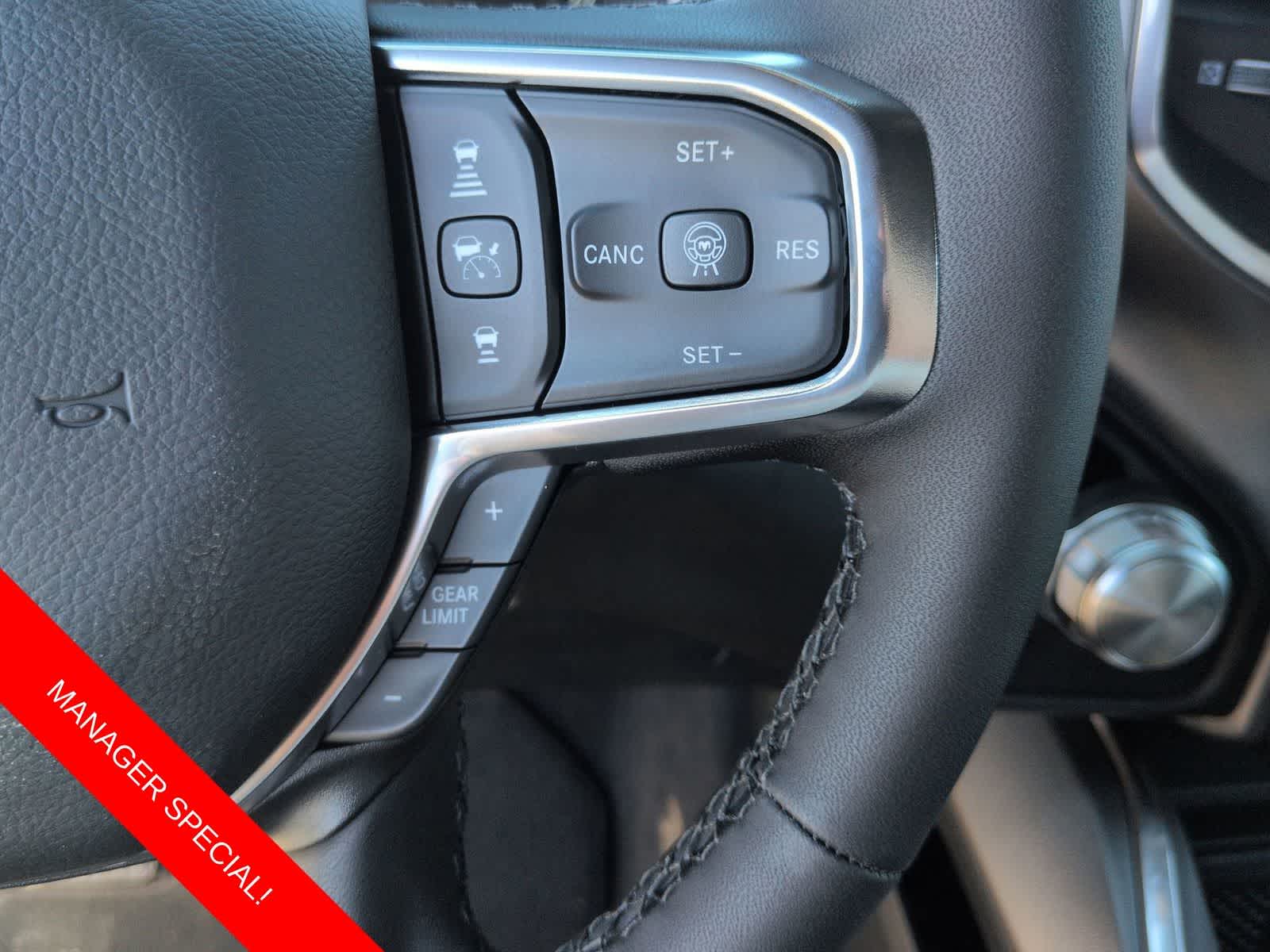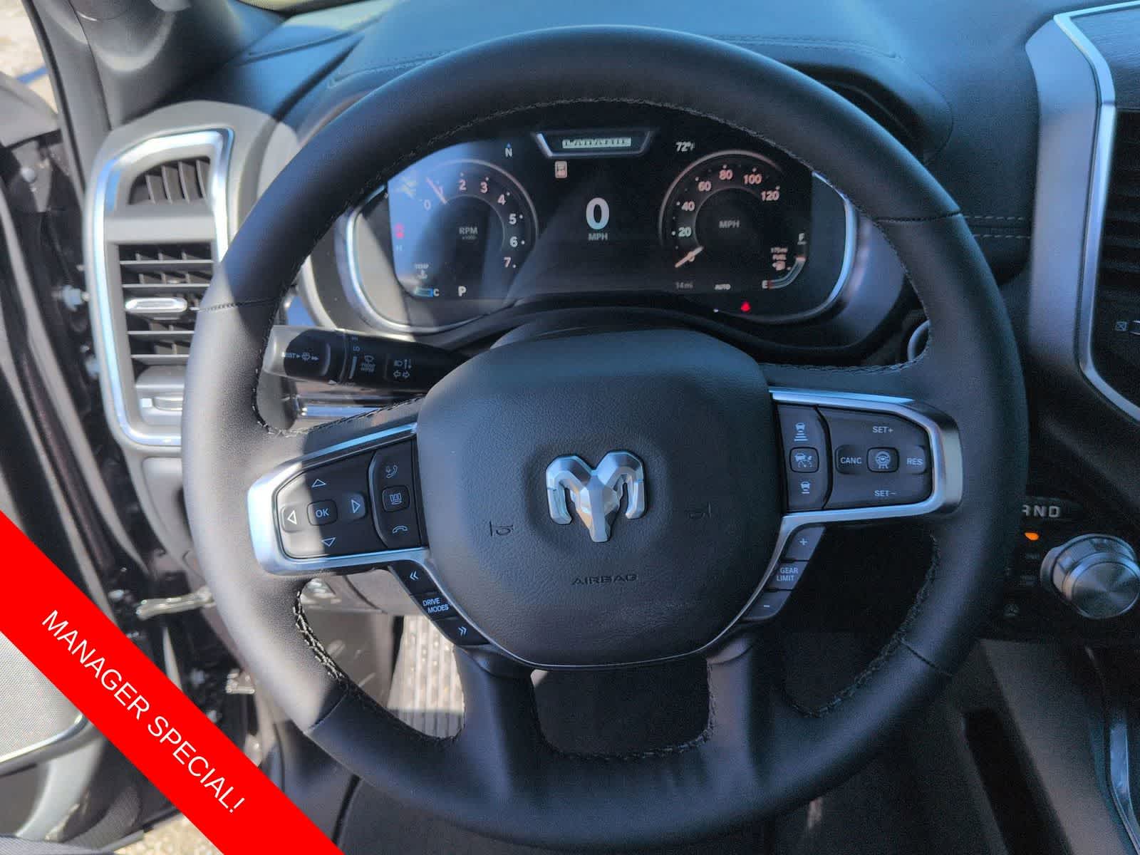 1500 Laramie is nicely equipped with Advanced Safety Group II (12-Way/1-Way Trailer Connector, Active Driving Assist System, Drowsy Driver Detection, Evasive Steer Assist, Exterior Mirrors Approach Lamps, Intersection Collision Assist System, Surround View Camera System, and Traffic Sign Recognition), Laramie Level 2 Equipment Group (14.4 Touchscreen Display, 4G LTE Wi-Fi Hot Spot, Cluster 12 TFT Color Display, Connected Travel and Traffic Services, Connectivity - US/Canada, Front Passenger Interactive Display, GPS Navigation, Harman/Kardon 19 Speaker Premium Sound, Integrated Center Stack Radio, Integrated Voice Command with Bluetooth®, Power Tailgate, Radio: Uconnect 5 Nav with 14.4 Display, Rain Sensitive Windshield Wipers, SiriusXM Radio Service, SiriusXM with 360L, and USB Host Flip), Night Edition (Accent Color Door Handles, Accent Color Premium Power Mirrors, Accent Color Tailgate Handle, Anti-Spin Differential Rear Axle, Auto Power-Folding Mirrors, Auto-Dimming Exterior Driver Mirror, Black Exterior Truck Badging, Black Headlamp Bezels, Black Interior Accents, Black Painted Exterior Mirrors Caps, Black Tail Lamp Bezels, Body Color Front Bumper, Body Color Rear Bumper with Step Pads, Convex Wide-Angle Exterior Mirror Insert, Dual Exhaust with Black Tips, Exterior Mirrors Courtesy Lamps, Exterior Mirrors with Heating Element, Exterior Mirrors with Memory, Exterior Mirrors with Supplemental Signals, Grille Surround 3 Black Texture 2 Black, Pirelli Brand Tires, Proximity Approach/Departure Lamps, RAM Grille Badge - Black, Sport Performance Hood, and Wheels: 22 x 9 Forged Aluminum), Quick Order Package 21H Laramie, Technology Group (Heads-Up Display and LED CHMSL Lamp), 10 Speakers, 3.55 Rear Axle Ratio, 4-Wheel Disc Brakes, ABS brakes, Active Noise Control System, Adjustable pedals, Air Conditioning, Alloy wheels, AM/FM radio: SiriusXM with 360L, Apple CarPlay/Android Auto, Audio memory, Auto High-beam Headlights, Auto-dimming door mirrors, Auto-dimming Rear-View mirror, Automatic temperature control, Brake assist, Bumpers: chrome, Chrome Exterior Mirrors, Compass, Delay-off headlights, Dome Dual LED Reading Lamp, Driver door bin, Driver vanity mirror, Dual front impact airbags, Dual front side impact airbags, Dual-Pane Panoramic Sunroof, Electronic Stability Control, Front anti-roll bar, Front Bucket Seats, Front Center Armrest w/Storage, Front dual zone A/C, Front fog lights, Front reading lights, Front wheel independent suspension, Fully automatic headlights, Garage door transmitter, Heated door mirrors, Heated front seats, Heated rear seats, Heated steering wheel, Illuminated entry, Leather steering wheel, Leather Trimmed Bucket Seats, LED Dome/Reading Lamp, Low tire pressure warning, Memory seat, Navigation System, Occupant sensing airbag, Off-Road Information Pages, Outside temperature display, Overhead airbag, Overhead console, Panic alarm, ParkView Rear Back-Up Camera, Passenger door bin, Passenger vanity mirror, Pedal memory, Power Deployable Running Boards, Power door mirrors, Power driver seat, Power passenger seat, Power steering, Power windows, Radio data system, Radio: Uconnect 5 Navigation with 12.0 Display, RAM Grille Badge - Chrome, Rear anti-roll bar, Rear reading lights, Rear seat center armrest, Rear step bumper, Remote keyless entry, Security system, Speed control, Split folding rear seat, Steering wheel mounted audio controls, Tachometer, Tele