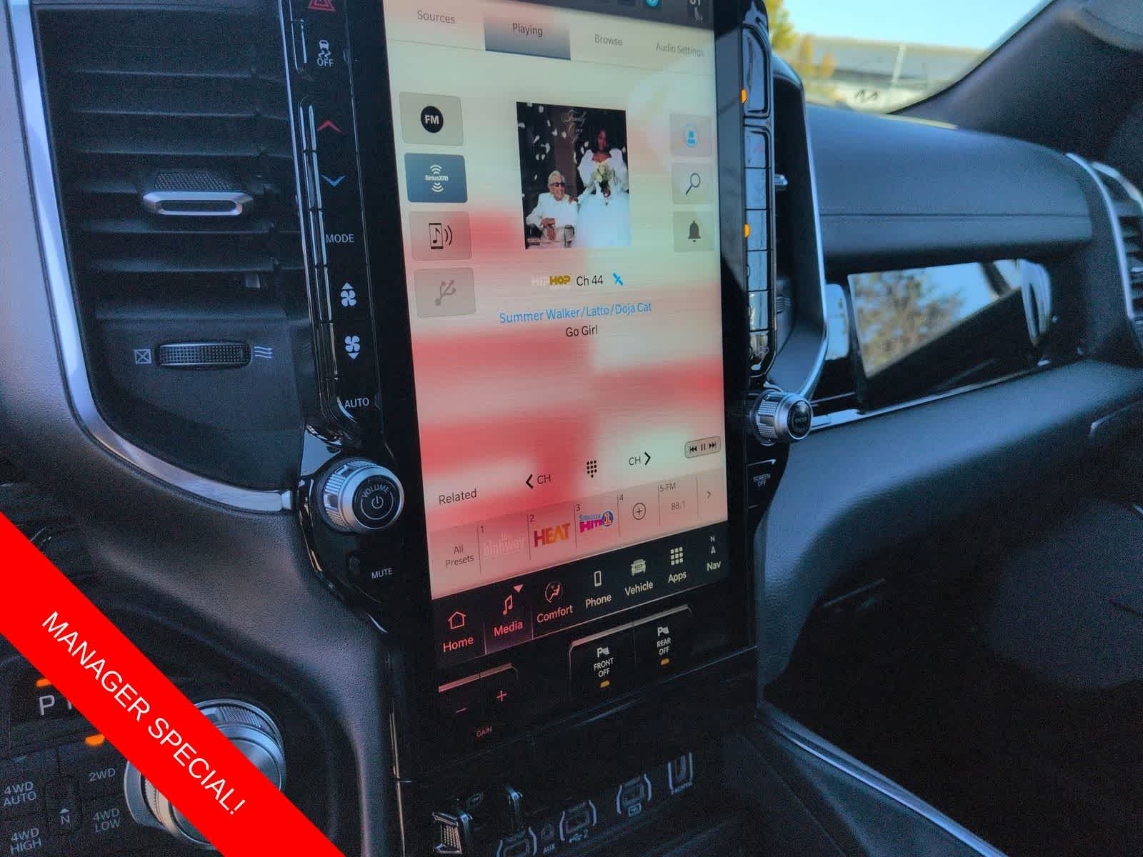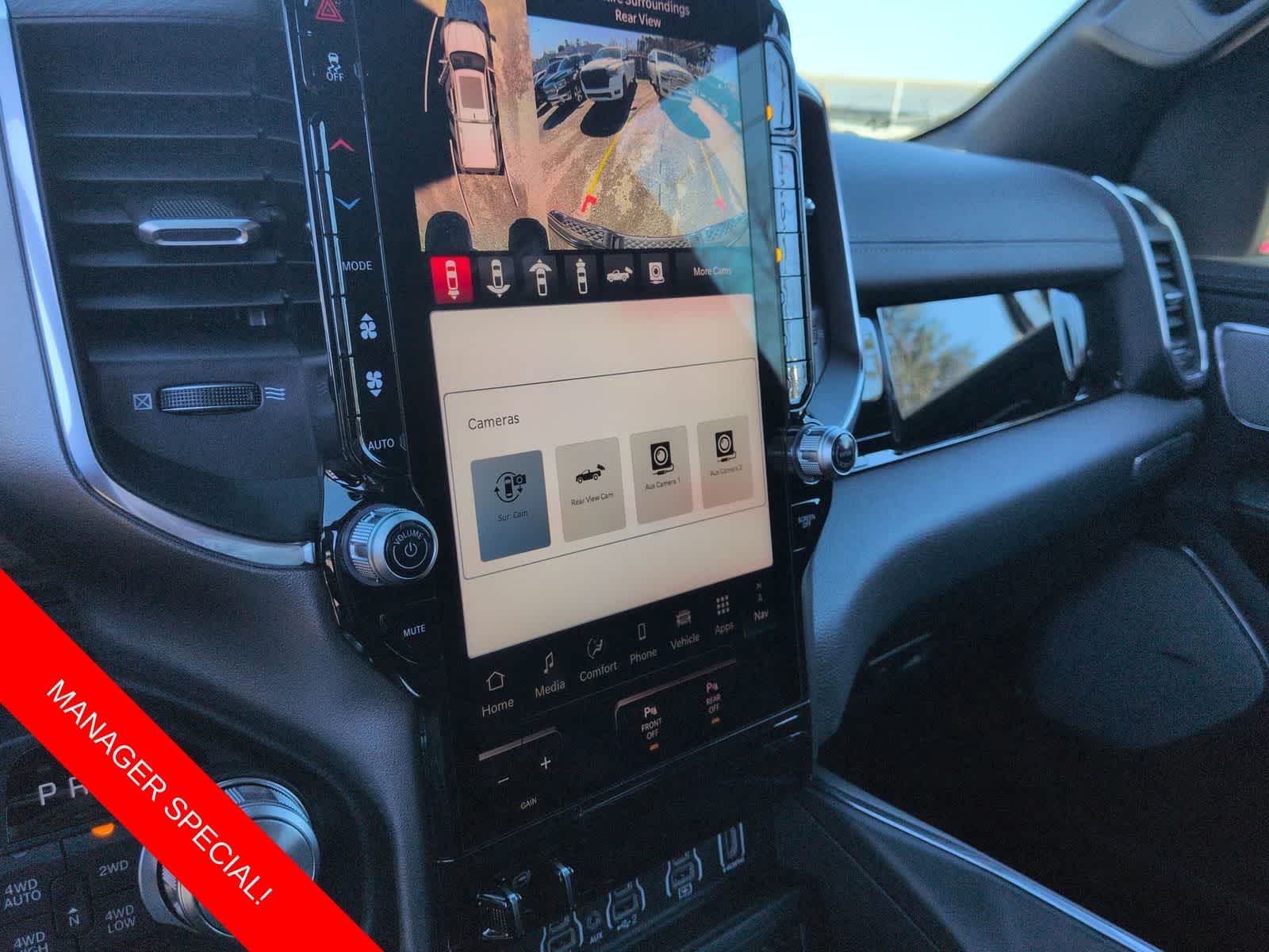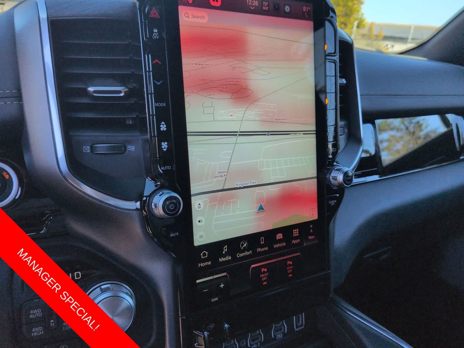 1500 Laramie is nicely equipped with Advanced Safety Group II (12-Way/1-Way Trailer Connector, Active Driving Assist System, Drowsy Driver Detection, Evasive Steer Assist, Exterior Mirrors Approach Lamps, Intersection Collision Assist System, Surround View Camera System, and Traffic Sign Recognition), Laramie Level 2 Equipment Group (14.4 Touchscreen Display, 4G LTE Wi-Fi Hot Spot, Cluster 12 TFT Color Display, Connected Travel and Traffic Services, Connectivity - US/Canada, Front Passenger Interactive Display, GPS Navigation, Harman/Kardon 19 Speaker Premium Sound, Integrated Center Stack Radio, Integrated Voice Command with Bluetooth®, Power Tailgate, Radio: Uconnect 5 Nav with 14.4 Display, Rain Sensitive Windshield Wipers, SiriusXM Radio Service, SiriusXM with 360L, and USB Host Flip), Night Edition (Accent Color Door Handles, Accent Color Premium Power Mirrors, Accent Color Tailgate Handle, Anti-Spin Differential Rear Axle, Auto Power-Folding Mirrors, Auto-Dimming Exterior Driver Mirror, Black Exterior Truck Badging, Black Headlamp Bezels, Black Interior Accents, Black Painted Exterior Mirrors Caps, Black Tail Lamp Bezels, Body Color Front Bumper, Body Color Rear Bumper with Step Pads, Convex Wide-Angle Exterior Mirror Insert, Dual Exhaust with Black Tips, Exterior Mirrors Courtesy Lamps, Exterior Mirrors with Heating Element, Exterior Mirrors with Memory, Exterior Mirrors with Supplemental Signals, Grille Surround 3 Black Texture 2 Black, Pirelli Brand Tires, Proximity Approach/Departure Lamps, RAM Grille Badge - Black, Sport Performance Hood, and Wheels: 22 x 9 Forged Aluminum), Quick Order Package 21H Laramie, Technology Group (Heads-Up Display and LED CHMSL Lamp), 10 Speakers, 3.55 Rear Axle Ratio, 4-Wheel Disc Brakes, ABS brakes, Active Noise Control System, Adjustable pedals, Air Conditioning, Alloy wheels, AM/FM radio: SiriusXM with 360L, Apple CarPlay/Android Auto, Audio memory, Auto High-beam Headlights, Auto-dimming door mirrors, Auto-dimming Rear-View mirror, Automatic temperature control, Brake assist, Bumpers: chrome, Chrome Exterior Mirrors, Compass, Delay-off headlights, Dome Dual LED Reading Lamp, Driver door bin, Driver vanity mirror, Dual front impact airbags, Dual front side impact airbags, Dual-Pane Panoramic Sunroof, Electronic Stability Control, Front anti-roll bar, Front Bucket Seats, Front Center Armrest w/Storage, Front dual zone A/C, Front fog lights, Front reading lights, Front wheel independent suspension, Fully automatic headlights, Garage door transmitter, Heated door mirrors, Heated front seats, Heated rear seats, Heated steering wheel, Illuminated entry, Leather steering wheel, Leather Trimmed Bucket Seats, LED Dome/Reading Lamp, Low tire pressure warning, Memory seat, Navigation System, Occupant sensing airbag, Off-Road Information Pages, Outside temperature display, Overhead airbag, Overhead console, Panic alarm, ParkView Rear Back-Up Camera, Passenger door bin, Passenger vanity mirror, Pedal memory, Power Deployable Running Boards, Power door mirrors, Power driver seat, Power passenger seat, Power steering, Power windows, Radio data system, Radio: Uconnect 5 Navigation with 12.0 Display, RAM Grille Badge - Chrome, Rear anti-roll bar, Rear reading lights, Rear seat center armrest, Rear step bumper, Remote keyless entry, Security system, Speed control, Split folding rear seat, Steering wheel mounted audio controls, Tachometer, Tele