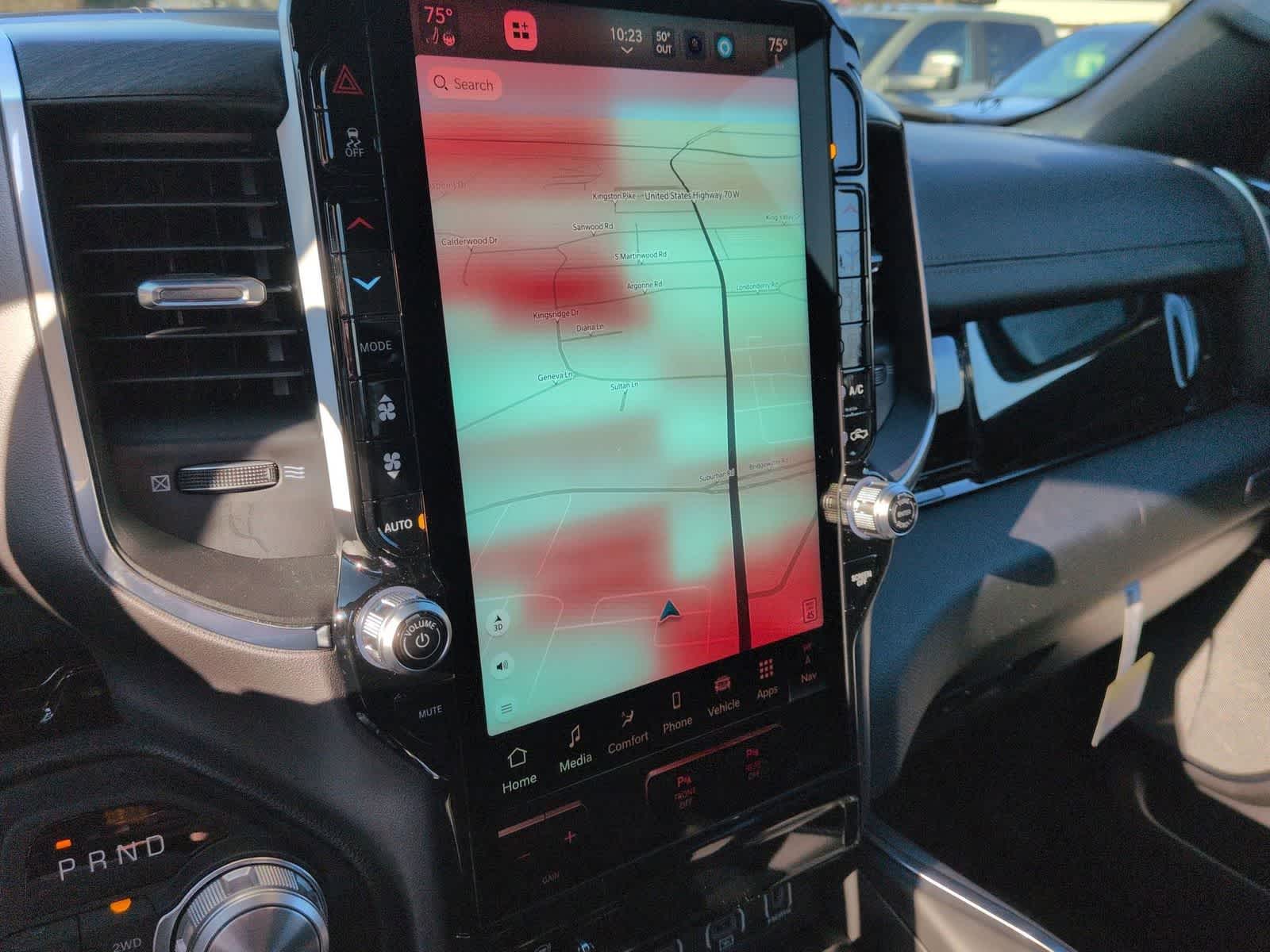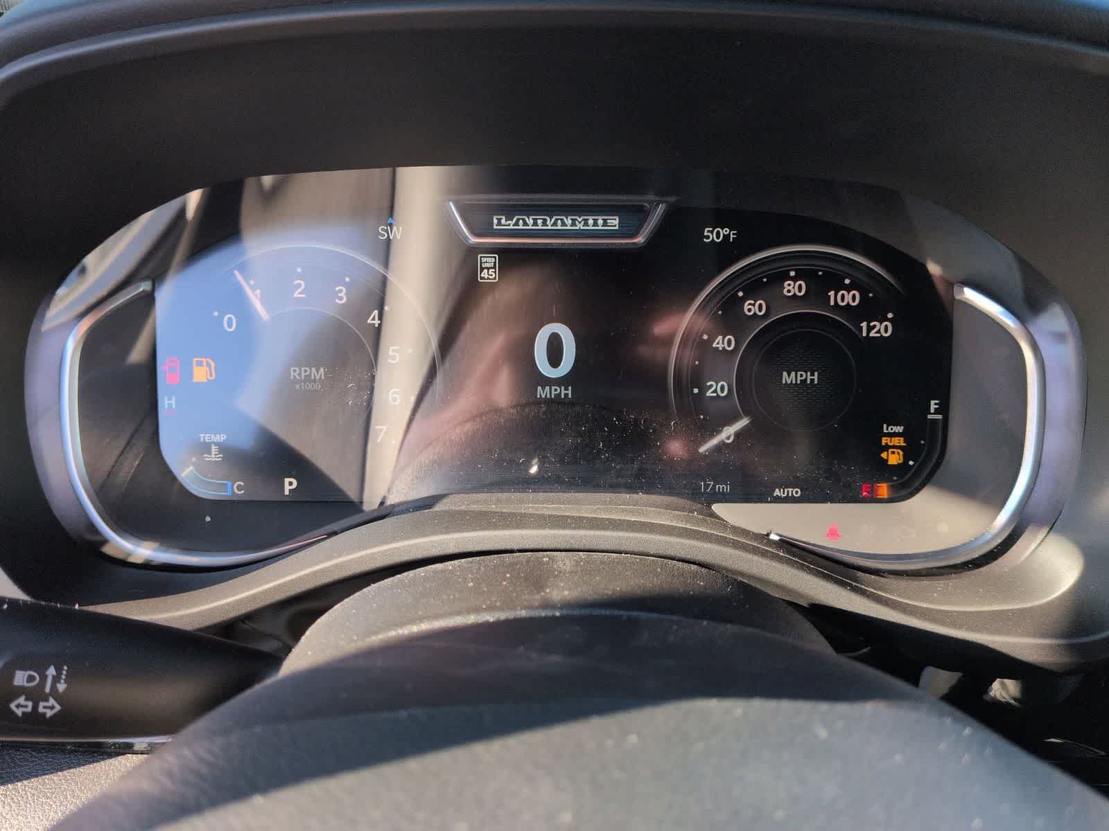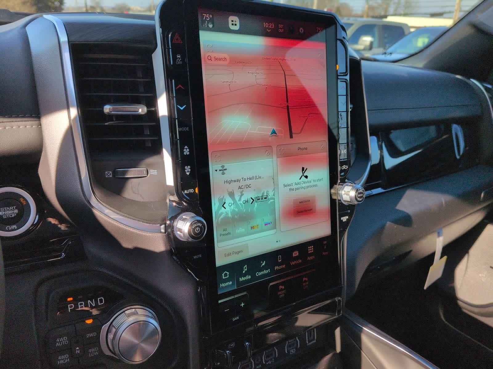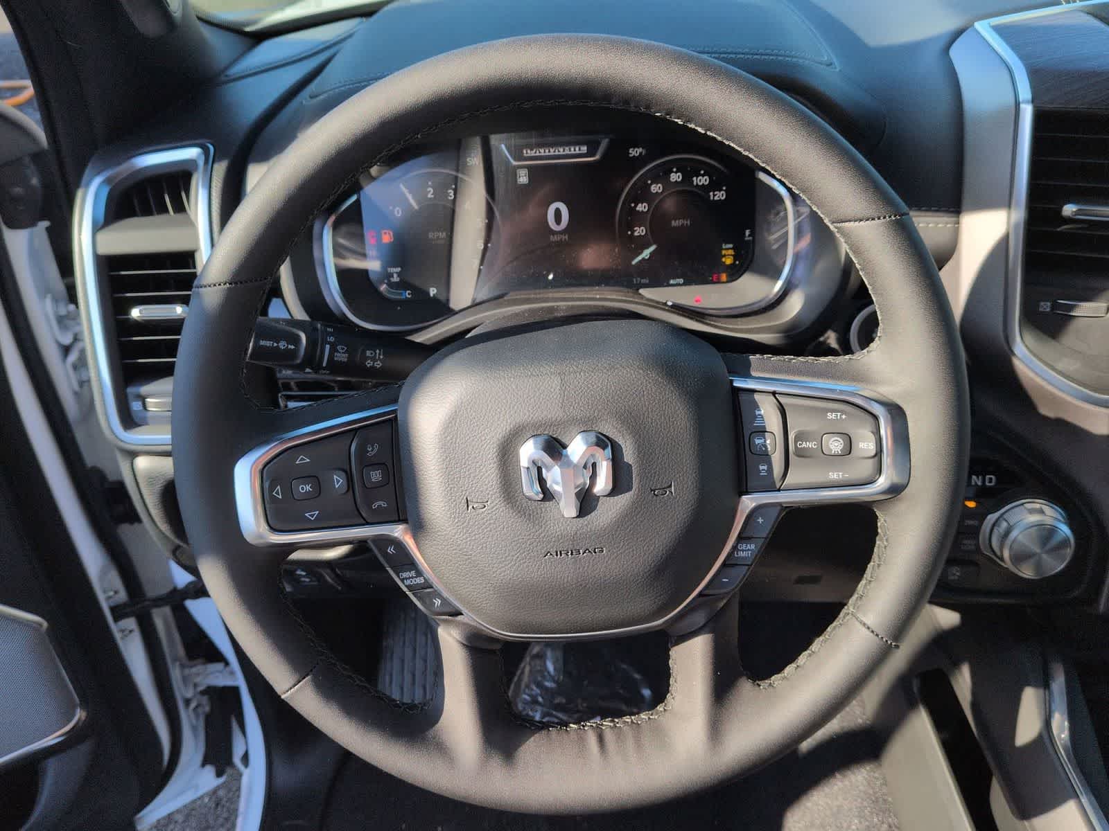 1500 Laramie is nicely equipped with Advanced Safety Group II (12-Way/1-Way Trailer Connector, Active Driving Assist System, Drowsy Driver Detection, Evasive Steer Assist, Exterior Mirrors Approach Lamps, Intersection Collision Assist System, Surround View Camera System, and Traffic Sign Recognition), Laramie Level 2 Equipment Group (14.4 Touchscreen Display, 4G LTE Wi-Fi Hot Spot, Cluster 12 TFT Color Display, Connected Travel and Traffic Services, Connectivity - US/Canada, Front Passenger Interactive Display, GPS Navigation, Harman/Kardon 19 Speaker Premium Sound, Integrated Center Stack Radio, Integrated Voice Command with Bluetooth®, Power Tailgate, Radio: Uconnect 5 Nav with 14.4 Display, Rain Sensitive Windshield Wipers, SiriusXM Radio Service, SiriusXM with 360L, and USB Host Flip), Night Edition (Accent Color Door Handles, Accent Color Premium Power Mirrors, Accent Color Tailgate Handle, Anti-Spin Differential Rear Axle, Auto Power-Folding Mirrors, Auto-Dimming Exterior Driver Mirror, Black Exterior Truck Badging, Black Headlamp Bezels, Black Interior Accents, Black Painted Exterior Mirrors Caps, Black Tail Lamp Bezels, Body Color Front Bumper, Body Color Rear Bumper with Step Pads, Convex Wide-Angle Exterior Mirror Insert, Dual Exhaust with Black Tips, Exterior Mirrors Courtesy Lamps, Exterior Mirrors with Heating Element, Exterior Mirrors with Memory, Exterior Mirrors with Supplemental Signals, Grille Surround 3 Black Texture 2 Black, Pirelli Brand Tires, Proximity Approach/Departure Lamps, RAM Grille Badge - Black, Sport Performance Hood, and Wheels: 22 x 9 Forged Aluminum), Quick Order Package 21H Laramie, Technology Group (Heads-Up Display and LED CHMSL Lamp), 10 Speakers, 3.55 Rear Axle Ratio, 4-Wheel Disc Brakes, ABS brakes, Active Noise Control System, Adjustable pedals, Air Conditioning, Alloy wheels, AM/FM radio: SiriusXM with 360L, Apple CarPlay/Android Auto, Audio memory, Auto High-beam Headlights, Auto-dimming door mirrors, Auto-dimming Rear-View mirror, Automatic temperature control, Brake assist, Bumpers: chrome, Chrome Exterior Mirrors, Compass, Delay-off headlights, Dome Dual LED Reading Lamp, Driver door bin, Driver vanity mirror, Dual front impact airbags, Dual front side impact airbags, Dual-Pane Panoramic Sunroof, Electronic Stability Control, Front anti-roll bar, Front Bucket Seats, Front Center Armrest w/Storage, Front dual zone A/C, Front fog lights, Front reading lights, Front wheel independent suspension, Fully automatic headlights, Garage door transmitter, Heated door mirrors, Heated front seats, Heated rear seats, Heated steering wheel, Illuminated entry, Leather steering wheel, Leather Trimmed Bucket Seats, LED Dome/Reading Lamp, Low tire pressure warning, Memory seat, Navigation System, Occupant sensing airbag, Off-Road Information Pages, Outside temperature display, Overhead airbag, Overhead console, Panic alarm, ParkView Rear Back-Up Camera, Passenger door bin, Passenger vanity mirror, Pedal memory, Power Deployable Running Boards, Power door mirrors, Power driver seat, Power passenger seat, Power steering, Power windows, Radio data system, Radio: Uconnect 5 Navigation with 12.0 Display, RAM Grille Badge - Chrome, Rear anti-roll bar, Rear reading lights, Rear seat center armrest, Rear step bumper, Remote keyless entry, Security system, Speed control, Split folding rear seat, Steering wheel mounted audio controls, Tachometer, Telescoping stee