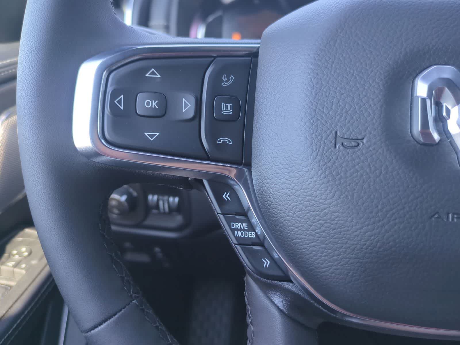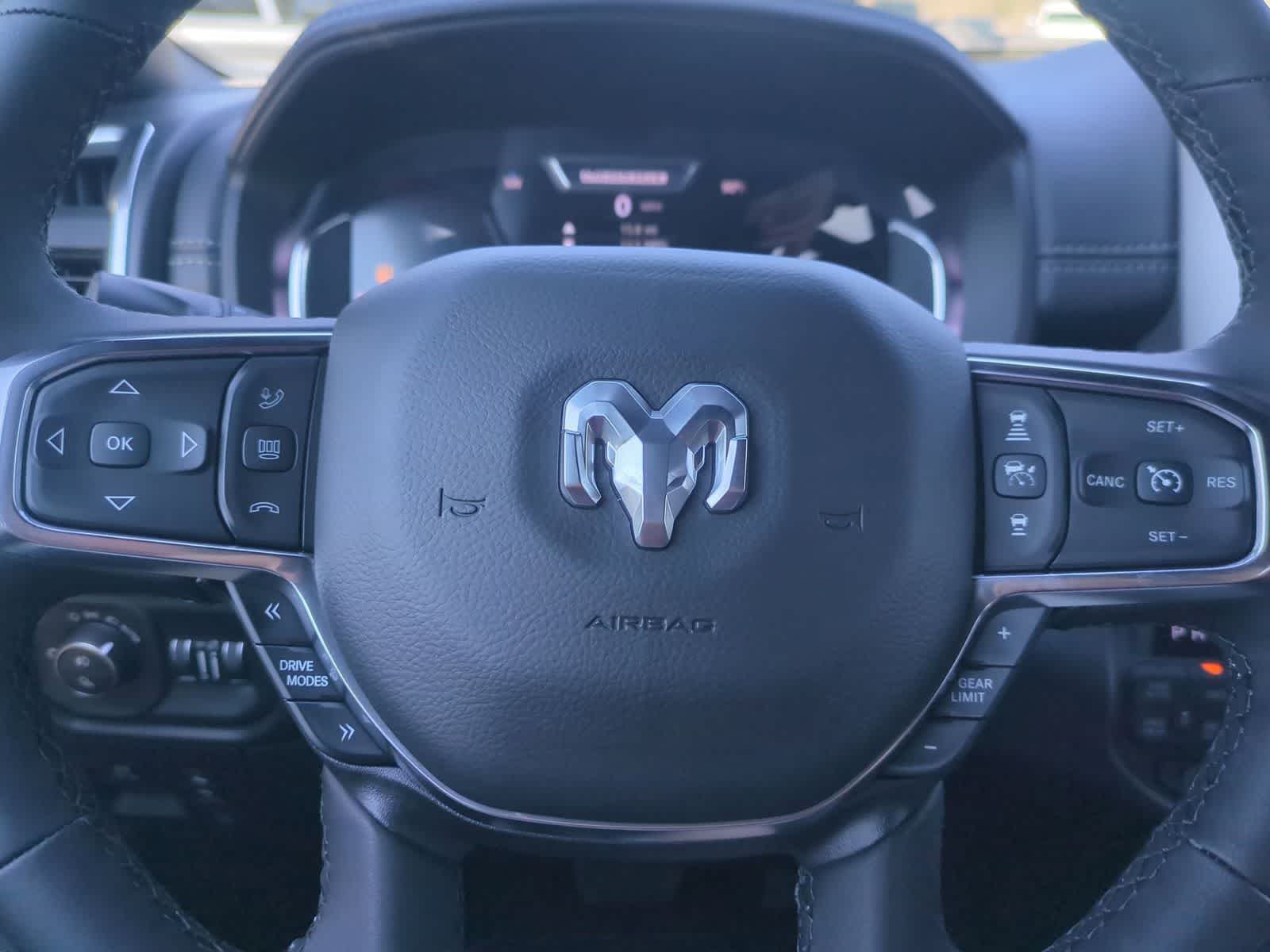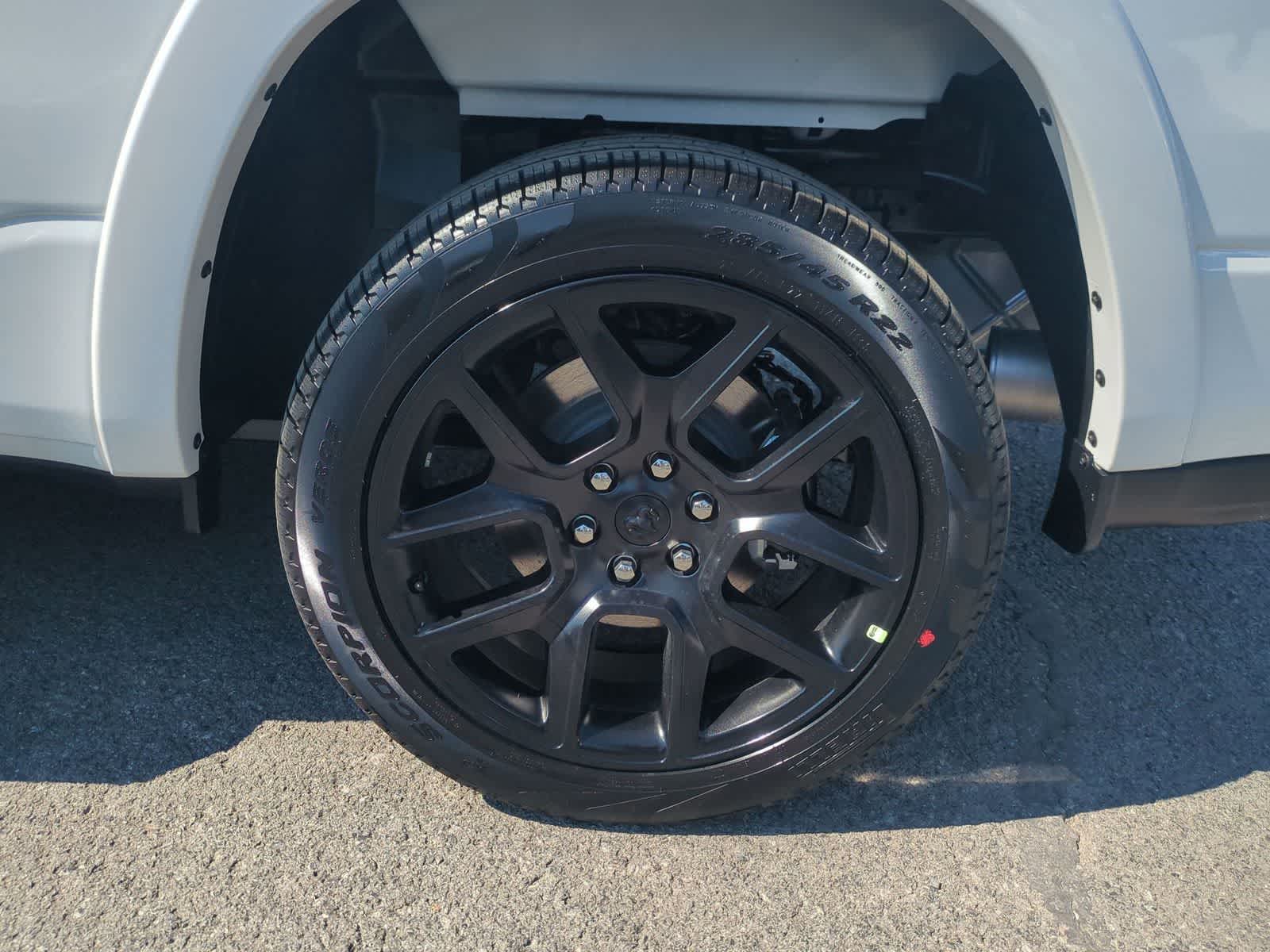 1500 Laramie is nicely equipped with Bed Utility Group (Exterior 115V AC Outlet, MOPAR 4 Adjustable Cargo Tie-Down Hooks, and MOPAR Spray in Bedliner), Laramie Level 2 Equipment Group (14.4 Touchscreen Display, 4G LTE Wi-Fi Hot Spot, Cluster 12 TFT Color Display, Connected Travel and Traffic Services, Connectivity - US/Canada, Front Passenger Interactive Display, GPS Navigation, Harman/Kardon 19 Speaker Premium Sound, Integrated Center Stack Radio, Integrated Voice Command with Bluetooth®, Power Tailgate, Radio: Uconnect 5 Nav with 14.4 Display, Rain Sensitive Windshield Wipers, SiriusXM Radio Service, SiriusXM with 360L, and USB Host Flip), Night Edition (Accent Color Door Handles, Accent Color Premium Power Mirrors, Accent Color Tailgate Handle, Anti-Spin Differential Rear Axle, Auto Power-Folding Mirrors, Auto-Dimming Exterior Driver Mirror, Black Exterior Truck Badging, Black Headlamp Bezels, Black Interior Accents, Black Painted Exterior Mirrors Caps, Black Tail Lamp Bezels, Body Color Front Bumper, Body Color Rear Bumper with Step Pads, Convex Wide-Angle Exterior Mirror Insert, Dual Exhaust with Black Tips, Exterior Mirrors Approach Lamps, Exterior Mirrors Courtesy Lamps, Exterior Mirrors with Heating Element, Exterior Mirrors with Memory, Exterior Mirrors with Supplemental Signals, Grille Surround 3 Black Texture 2 Black, Pirelli Brand Tires, Proximity Approach/Departure Lamps, RAM Grille Badge - Black, Sport Performance Hood, and Wheels: 22 x 9 Forged Aluminum), Quick Order Package 27H Laramie, 10 Speakers, 4-Wheel Disc Brakes, ABS brakes, Active Noise Control System, Adjustable pedals, Air Conditioning, Alloy wheels, AM/FM radio: SiriusXM with 360L, Apple CarPlay/Android Auto, Audio memory, Auto High-beam Headlights, Auto-dimming door mirrors, Auto-dimming Rear-View mirror, Automatic temperature control, Brake assist, Bumpers: chrome, Chrome Exterior Mirrors, Compass, Delay-off headlights, Driver door bin, Driver vanity mirror, Dual front impact airbags, Dual front side impact airbags, Electronic Stability Control, Front anti-roll bar, Front Bucket Seats, Front Center Armrest w/Storage, Front dual zone A/C, Front fog lights, Front reading lights, Front wheel independent suspension, Fully automatic headlights, Garage door transmitter, Heated door mirrors, Heated front seats, Heated rear seats, Heated steering wheel, Illuminated entry, Leather steering wheel, Leather Trimmed Bucket Seats, Low tire pressure warning, Manufacturers Statement of Origin, Memory seat, Mopar Black Tubular Side Steps, Navigation System, Occupant sensing airbag, Off-Road Information Pages, Outside temperature display, Overhead airbag, Overhead console, Panic alarm, ParkView Rear Back-Up Camera, Passenger door bin, Passenger vanity mirror, Pedal memory, Power door mirrors, Power driver seat, Power passenger seat, Power steering, Power windows, Radio data system, Radio: Uconnect 5 Navigation with 12.0 Display, RAM Grille Badge - Chrome, Rear anti-roll bar, Rear reading lights, Rear seat center armrest, Rear step bumper, Remote keyless entry, Security system, Speed control, Split folding rear seat, Steering wheel mounted audio controls, Tachometer, Telescoping steering wheel, Tilt steering wheel, Traction control, Trailer Brake Control, Trip computer, Turn signal indicator mirrors, Variably intermittent wipers, Ventilated front seats, Voltmeter, and Wheels