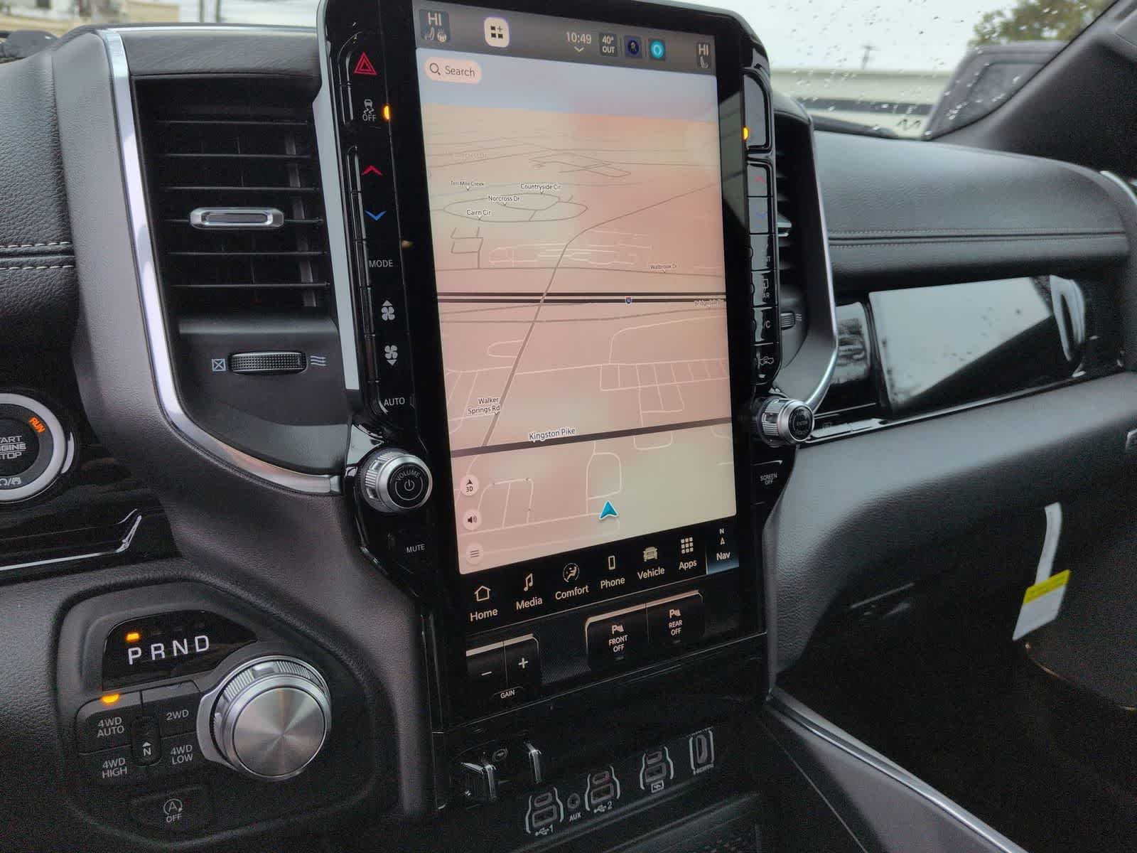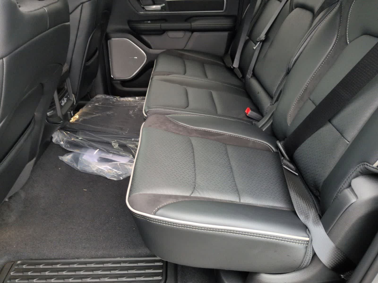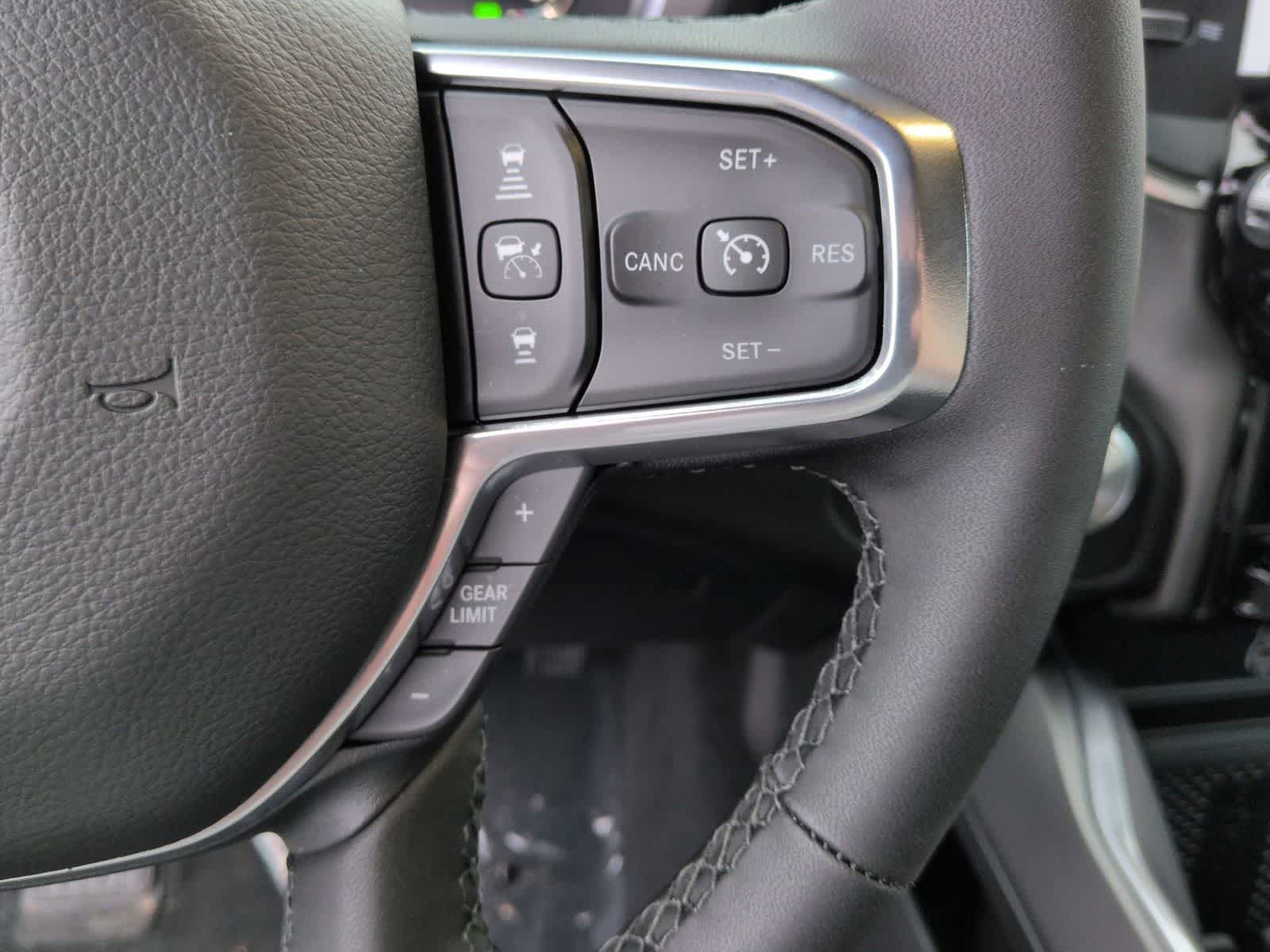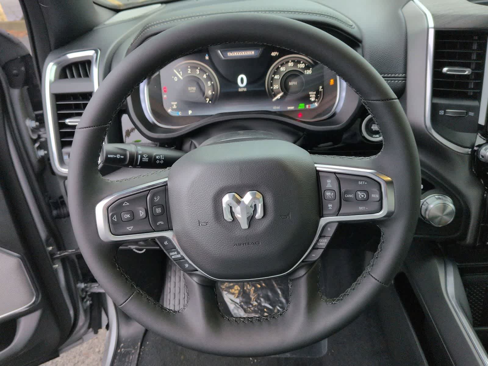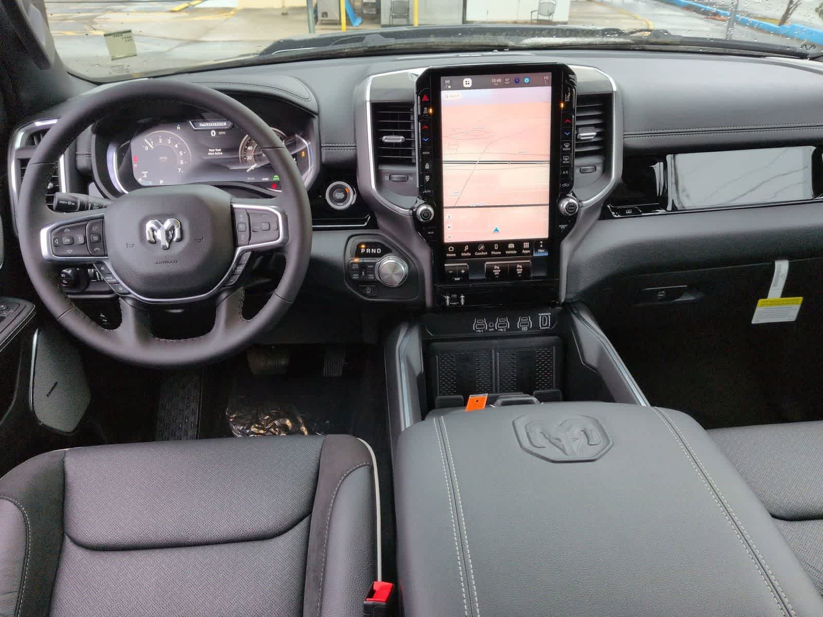 1500 Laramie is nicely equipped with Bed Utility Group (Exterior 115V AC Outlet, MOPAR 4 Adjustable Cargo Tie-Down Hooks, and MOPAR Spray in Bedliner), Laramie Level 2 Equipment Group (14.4 Touchscreen Display, 4G LTE Wi-Fi Hot Spot, Cluster 12 TFT Color Display, Connected Travel and Traffic Services, Connectivity - US/Canada, Front Passenger Interactive Display, GPS Navigation, Harman/Kardon 19 Speaker Premium Sound, Integrated Center Stack Radio, Integrated Voice Command with Bluetooth®, Power Tailgate, Radio: Uconnect 5 Nav with 14.4 Display, Rain Sensitive Windshield Wipers, SiriusXM Radio Service, SiriusXM with 360L, and USB Host Flip), Night Edition (Accent Color Door Handles, Accent Color Premium Power Mirrors, Accent Color Tailgate Handle, Anti-Spin Differential Rear Axle, Auto Power-Folding Mirrors, Auto-Dimming Exterior Driver Mirror, Black Exterior Truck Badging, Black Headlamp Bezels, Black Interior Accents, Black Painted Exterior Mirrors Caps, Black Tail Lamp Bezels, Body Color Front Bumper, Body Color Rear Bumper with Step Pads, Convex Wide-Angle Exterior Mirror Insert, Dual Exhaust with Black Tips, Exterior Mirrors Approach Lamps, Exterior Mirrors Courtesy Lamps, Exterior Mirrors with Heating Element, Exterior Mirrors with Memory, Exterior Mirrors with Supplemental Signals, Grille Surround 3 Black Texture 2 Black, Pirelli Brand Tires, Proximity Approach/Departure Lamps, RAM Grille Badge - Black, Sport Performance Hood, and Wheels: 22 x 9 Forged Aluminum), Quick Order Package 27H Laramie, 10 Speakers, 33 Gallon Fuel Tank, 4-Wheel Disc Brakes, ABS brakes, Active Noise Control System, Adjustable pedals, Air Conditioning, Alloy wheels, AM/FM radio: SiriusXM with 360L, Apple CarPlay/Android Auto, Audio memory, Auto High-beam Headlights, Auto-dimming door mirrors, Auto-dimming Rear-View mirror, Automatic temperature control, Brake assist, Bumpers: chrome, Chrome Exterior Mirrors, Compass, Delay-off headlights, Dome Dual LED Reading Lamp, Driver door bin, Driver vanity mirror, Dual front impact airbags, Dual front side impact airbags, Dual-Pane Panoramic Sunroof, Electronic Stability Control, Front anti-roll bar, Front Bucket Seats, Front Center Armrest w/Storage, Front dual zone A/C, Front fog lights, Front reading lights, Front wheel independent suspension, Fully automatic headlights, Garage door transmitter, Heated door mirrors, Heated front seats, Heated rear seats, Heated steering wheel, Illuminated entry, Leather steering wheel, Leather Trimmed Bucket Seats, LED Dome/Reading Lamp, Low tire pressure warning, Memory seat, Navigation System, Occupant sensing airbag, Off-Road Information Pages, Outside temperature display, Overhead airbag, Overhead console, Panic alarm, ParkView Rear Back-Up Camera, Passenger door bin, Passenger vanity mirror, Pedal memory, Power Deployable Running Boards, Power door mirrors, Power driver seat, Power passenger seat, Power steering, Power windows, Radio data system, Radio: Uconnect 5 Navigation with 12.0 Display, RAM Grille Badge - Chrome, Rear anti-roll bar, Rear reading lights, Rear seat center armrest, Rear step bumper, Remote keyless entry, Security system, Speed control, Split folding rear seat, Steering wheel mounted audio controls, Tachometer, Telescoping steering wheel, Tilt steering wheel, Traction control, Trailer Brake Control, Trip computer, Turn signal indicator mirrors, Variably