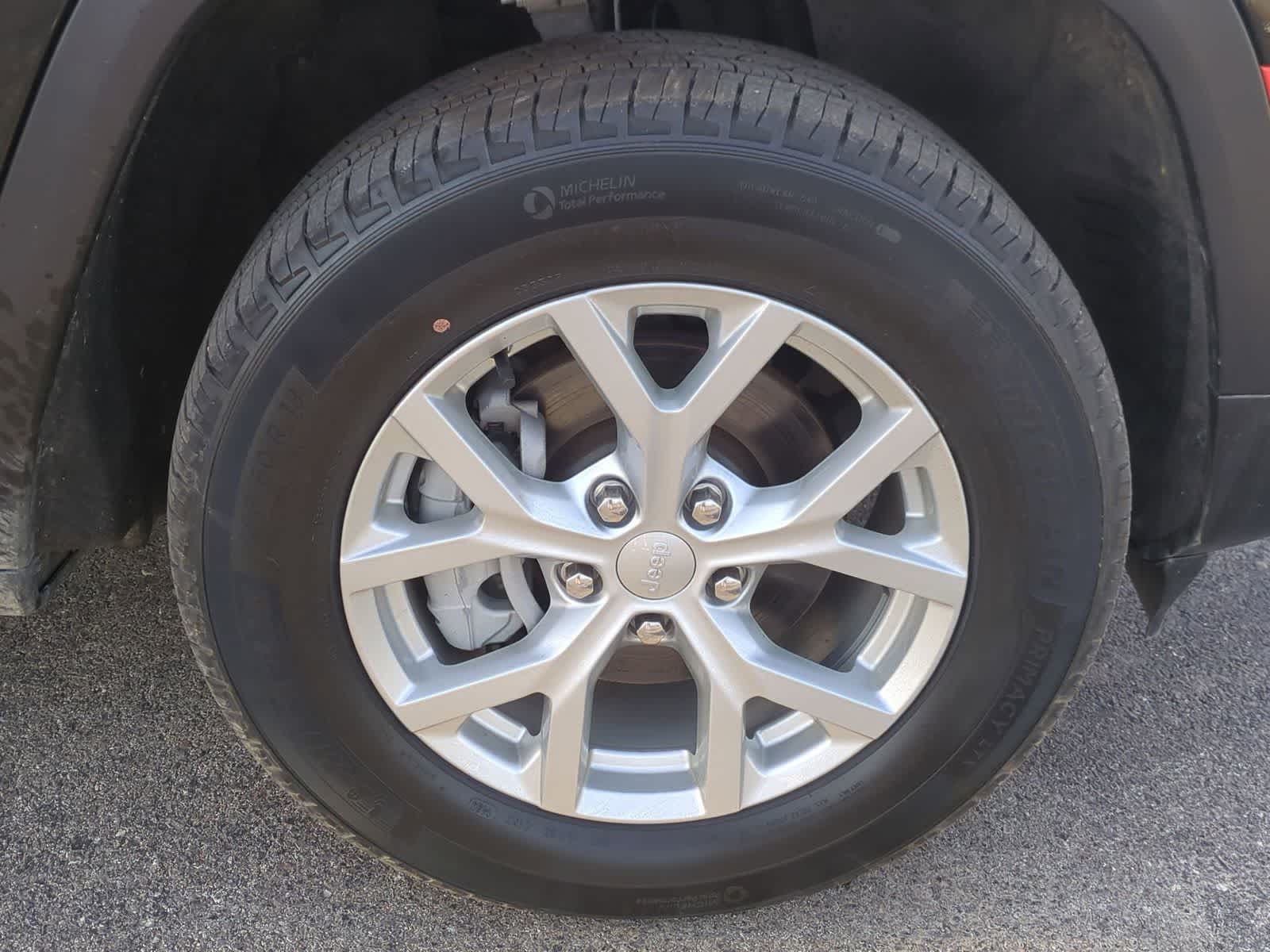 The striking exterior design of this Grand Cherokee Limited is complemented by the Molded In Color Black/Gloss Black Roof Rails and the 18 Fully Painted Aluminum Wheels, creating a bold and distinctive presence on the road.